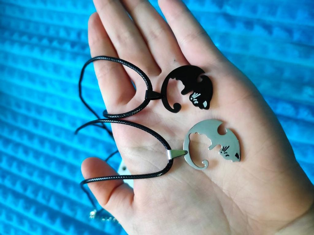 Очень милые кулончики, плотно входят в друг друга. На серебряном есть некие дефекты, сзади маленькое чёрное пятнышко, а спереди пару царапин, если не смотреть под определённым углом, то не видно. Чёрный кот идеальный, без царапин и пятен.