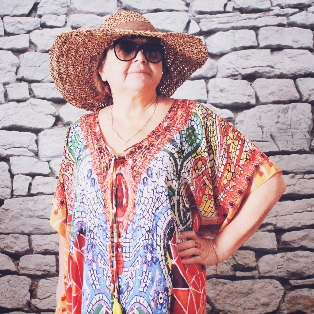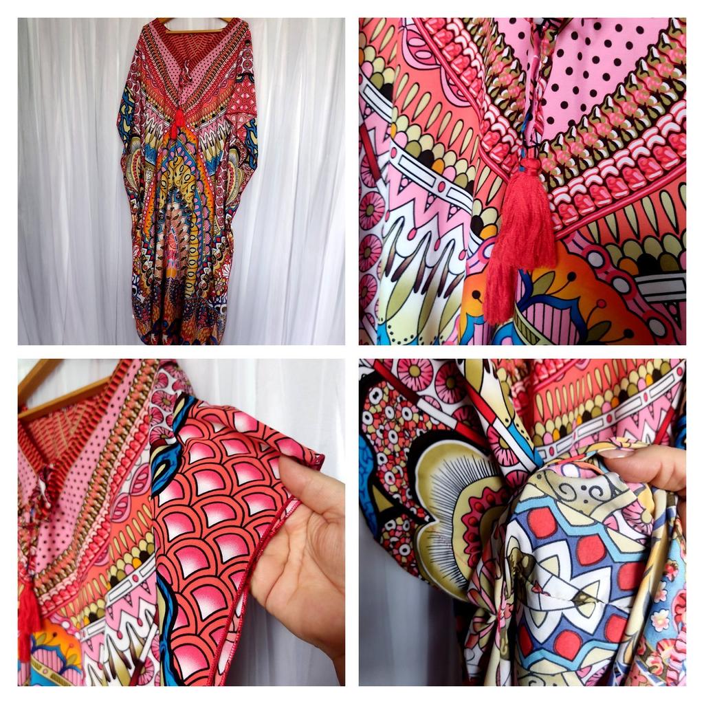 Пляжное платье от EDOLYNSA с роскошным этно-принтом). Я уже говорила, что купила в этом магазине несколько платьев себе и маме. Осталось показать два😄, то что вы наблюдаете на мне и еще одно. Это платьице я оставлю себе. Во-первых очень понравились ткань и принт, а во-вторых маман не смогла бы его носить при всем желании. Суть в том, что она 160 см. роста, и ей платье в пол. А эту модельку укоротить не получится, подол закруглен. В этом вся фишка). Мне на рост 182 см. длина комфортная. По сути это все тот же прямоугольник. Глубокая V-образная горловина украшена завязками с кисточками, два боковых шва, прорези для рук, по бокам разрезы. Вот и все. На выбор несколько цветовых решений. Я выбрала вариант, который называется красный. Единый размер, и он снова гигантский, девочки до 56 размера могут спокойно брать. Ткань приятная к телу, тяжеленькая, красиво драпируется, не просвечивает. Электризуется, поэтому без антистатика не обойтись. Зато стирается и утюжится легко. В общем я очень довольна нарядом. Можно на пляж, можно дома носить. Рекомендую. У меня все).