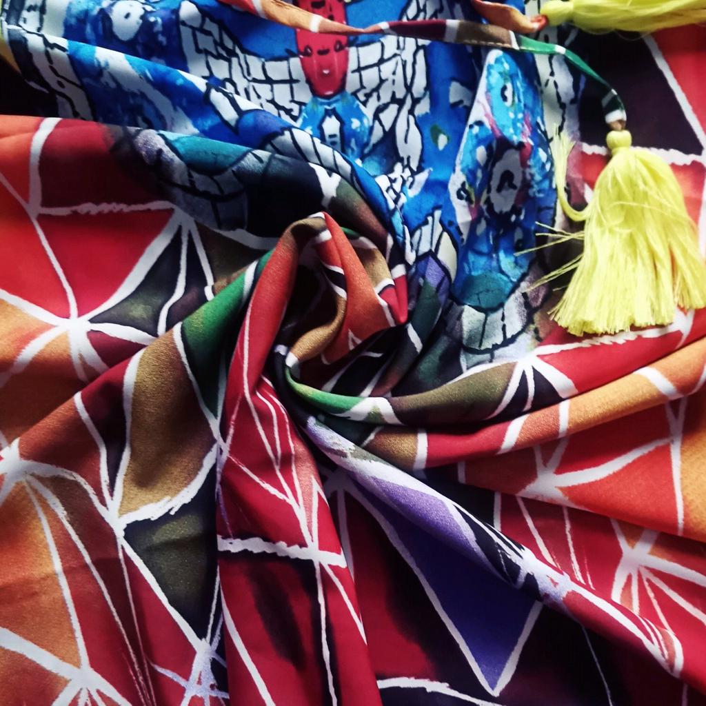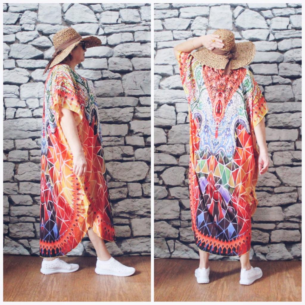 Яркая пляжная накидка. На самом деле я её получила в прошлом году. И даже уже брала с собой в отпуск, и должна сказать, что это очень удобная, и к тому же невероятно красивая вещь! Я ее надевала поверх мокрого купальника и мокрых пятен видно не было. К тому же сохнет накидка моментально! Глажки не требует. Я её неоднократно стирала в машинке; так вот, принт яркости не потерял, по размеру она не села, и выглядит, как новая. Накидка представляет собой прямоугольник, по бокам закругленные разрезы. Ширина 150 см, налезет всем! Мои размеры ОГ 120, ОТ 114, ОБ 135. Короче, универсальная вещь И выглядит достойно, можно носить не только на пляже, но и по городу пройтись.