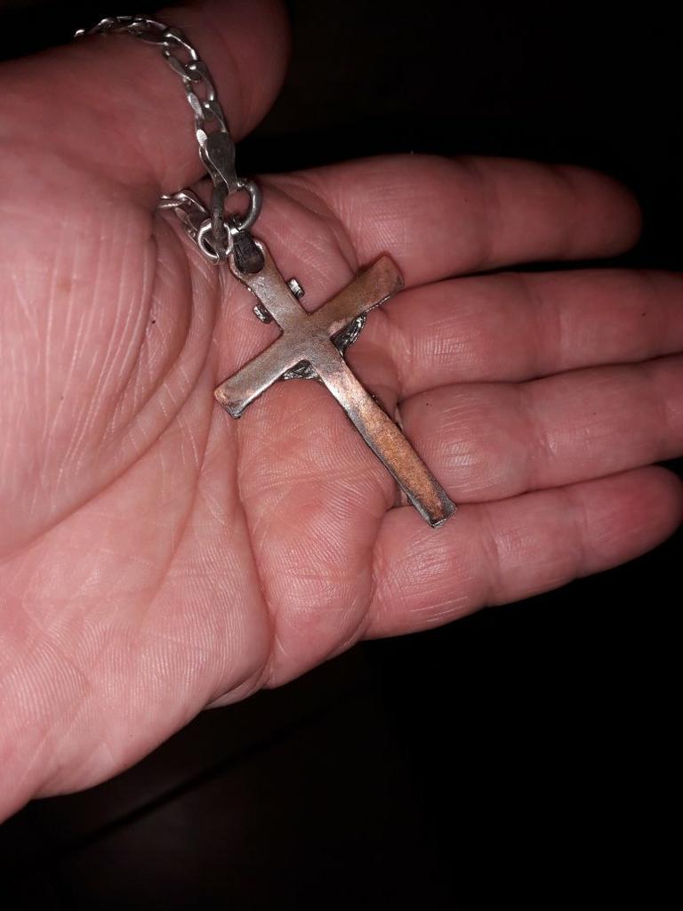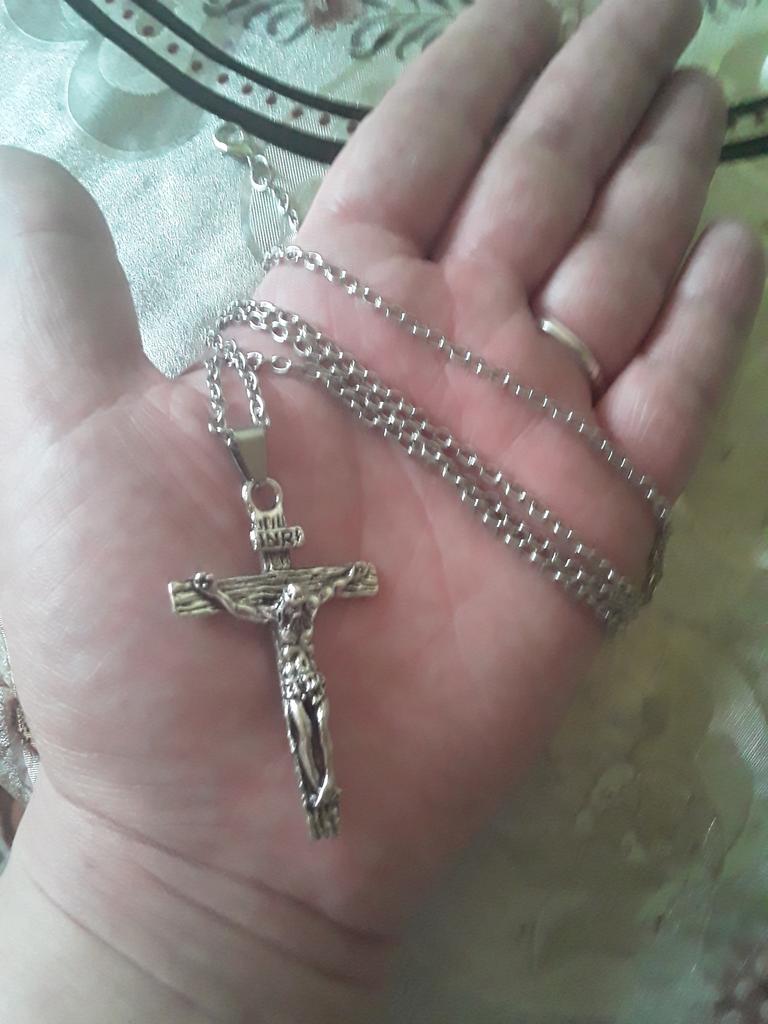 Нательный крест. Ожидал вообще другое увидеть.. Полностью не устроило то, что голова Иисуса наклонена от оси креста вперёд мм на 6. Это создаёт неудобство - цепляется за одежду подобно крючку. Да и тело выполнено ужасно грубо. Я не в восторге. Не рекомендую, разочаруетесь. РS: через неделю носки задняя сторона и зажим крестика облезли. На третьем фото это видно. Качество нулёвое. Не берите, не тратьте деньги.