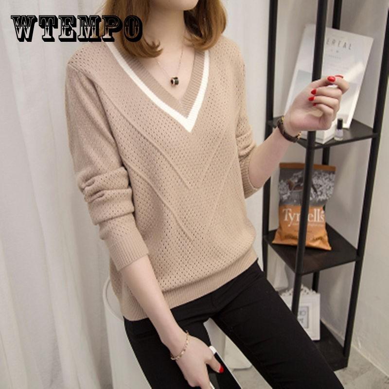 Осенний женский свитер с длинным рукавом, однотонный, с вырезом, повседневный пуловер, свободный женский свитер с V-образным вырезом — купить товар онлайн с бесплатной доставкой до всему миру!