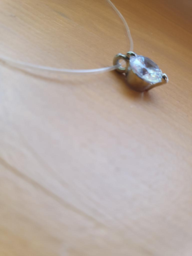 Подвеска-невидимка. Долго и придирчиво выбирала. Искала минимум металла в оправе, ибо он все равно быстро облезет. Да и саму идею "левитации сверкающей капли на нежной коже" утяжелит. Что оправдало мои ожидания. Металлическая оправа не громоздкая, в глаза не бросается. Силиконовый шнурок тонкий, крепкий, но мягкий. Камушек без дефектов. Чистый, без замутнений, огранка качественная. Карабин застёжки без перекосов, рабочий. Ложка дегтя все же нашлась. Камушек на мой вкус крупноват. Но это полбеды. Шнурок очень длинный. Подвеска должна лежать в яремной впадине. А на мою тонкую шею выходит очень низко. Не то. Но ловкость пальцев, 15 минут мучений и несколько мотивирующих терминов в адрес самой подвески и всей ее родни по женской линии помогли. Крепеж шнурка разогнула, укоротила, загнула, как было. В таком формате подвеска отличная - подойдёт на любой размер шеи.