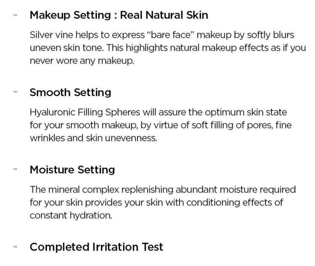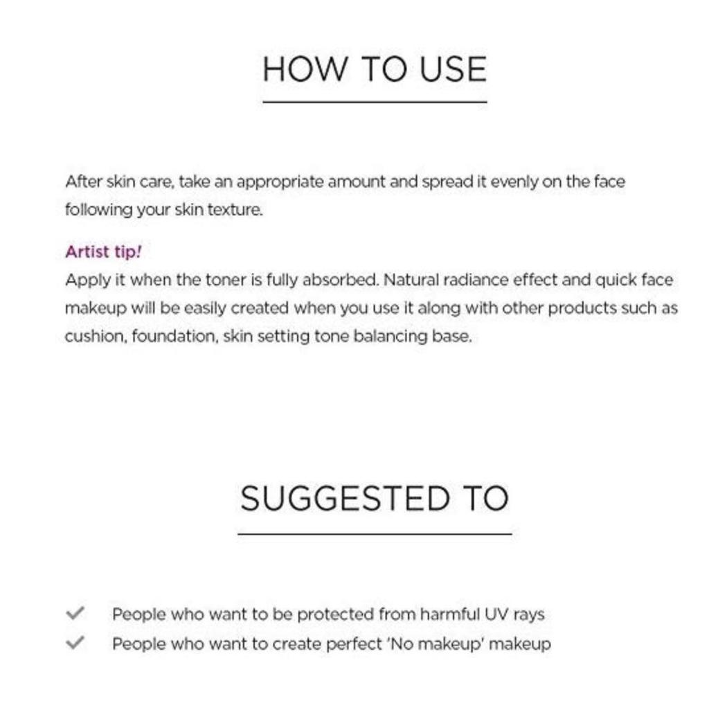 - База для балансировки тона, которая подчеркивает макияж голого лица, осветляя тусклую кожу и блокируя вредные ультрафиолетовые лучи..
