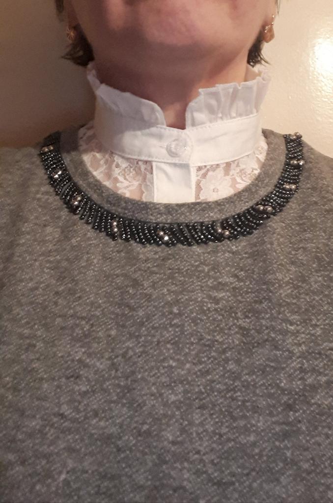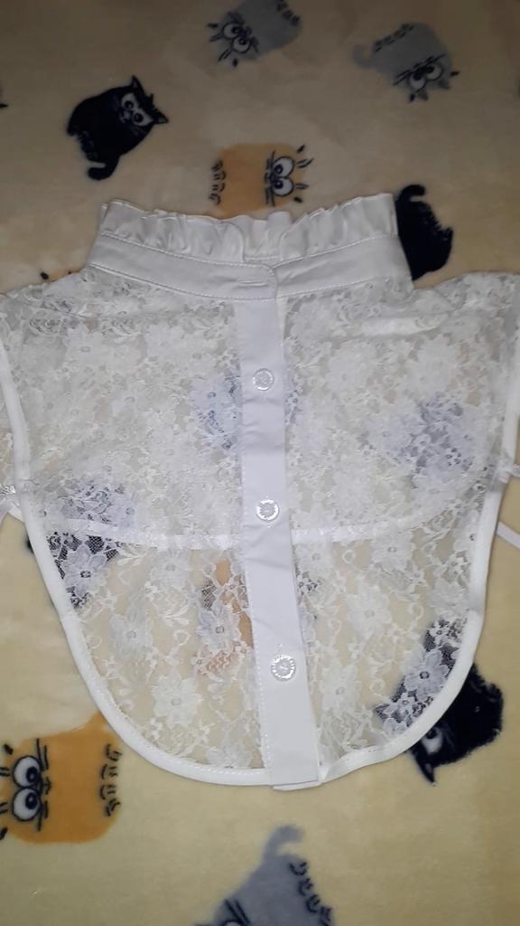 Получила кружевной воротник в белом цвете.Выполнен из гипюра,планка из х/б ткани.На мой размер 48-50,воротник подошел,на горловине пуговица застегивается.Выполнен аккурантно,были торчащие нитки,но все исправимо.Мне понравился.Покупала за 279 руб.Спасибо продавцу,спасибо Джум.