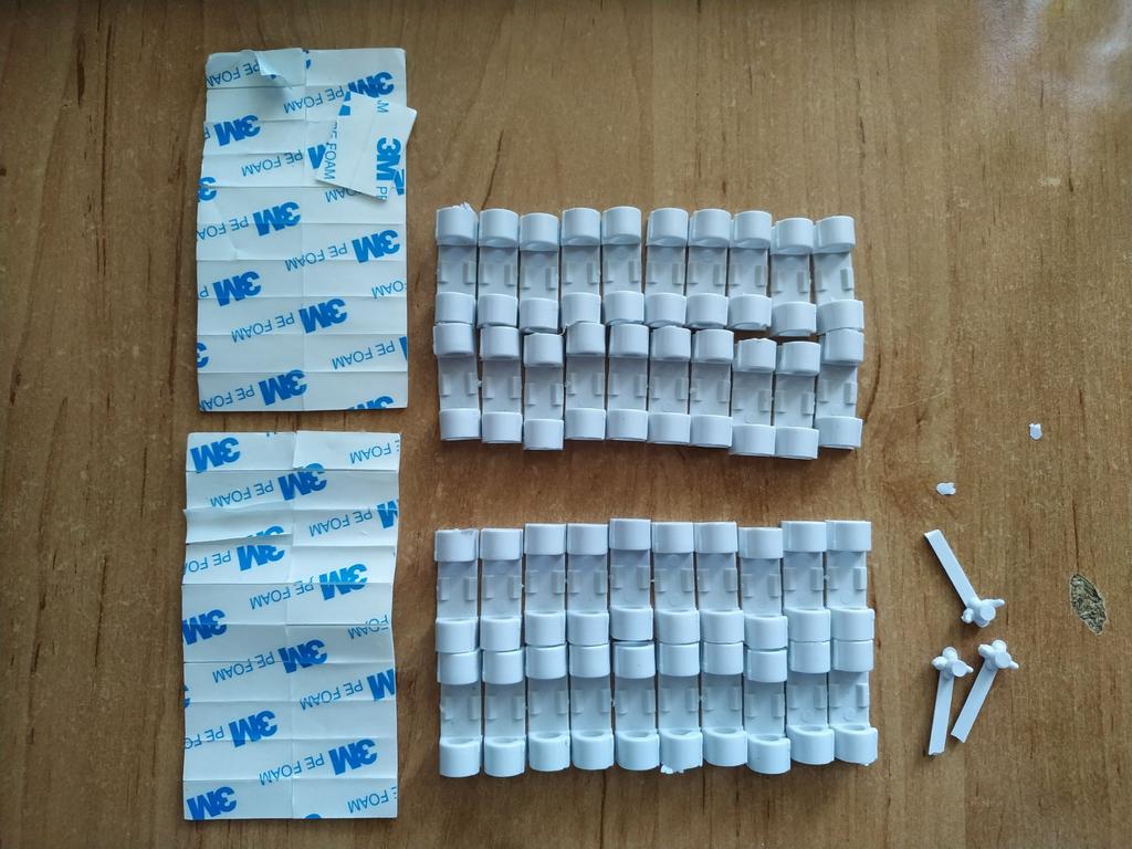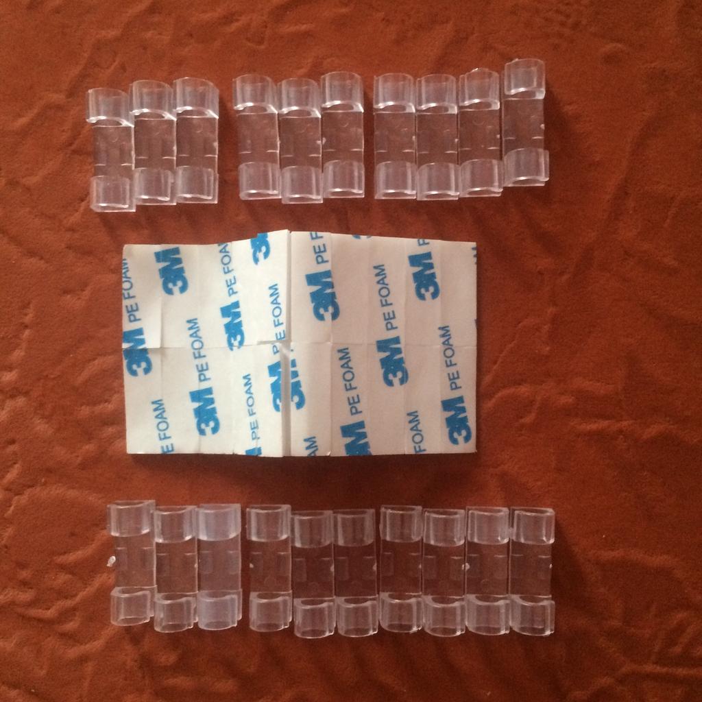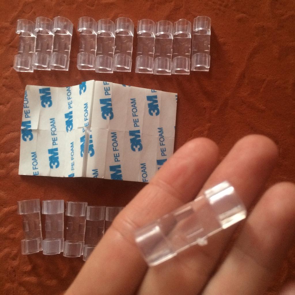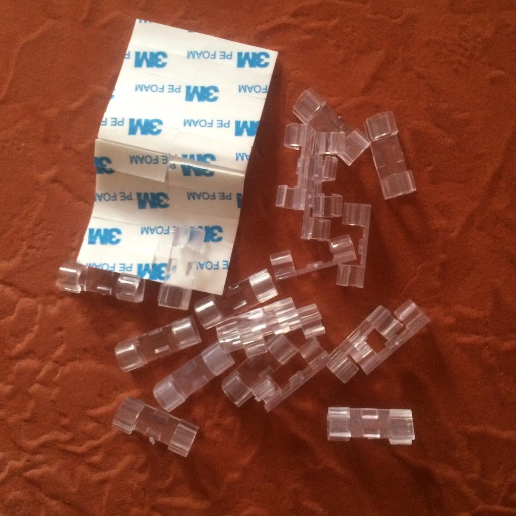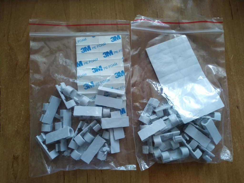 Набор из 40 креплений для проводов. Пришли 2 пакета по 20. Крепления из прозрачного пластика, довольно хрупкие на мой взгляд, при вставке провода нужно быть аккуратнее. Крепятся на двухсторонний скотч (в наборе кусочки вспененного полиэтилена со слоем клея с двух сторон, клеевая поверхность защищена вощёной бумагой). Заказала набор из 40 креплений для шнуров-проводов за 209 руб. (5,25 руб. за штуку). Информацию о доставке в почтовое отделение получила через 45 дней после даты заказа - долго. Пришли 16! заказов в одном пакете - удобно. За время доставки товар не пострадал - все крепления целые.