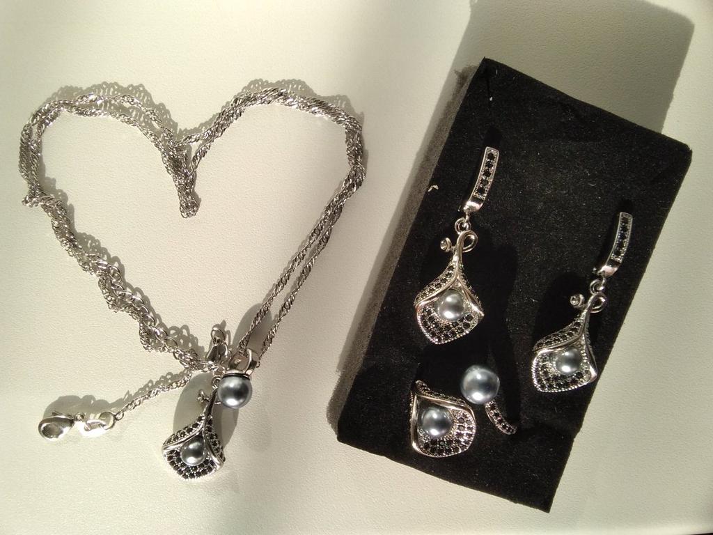 🔹🖤🐚Комплект украшений "Чёрная Жемчужина"🐚🖤🔹 🔹Посылочку получила ровно через 2 недели👍🎉😀 🔹Набор состоит из кулона на цепочке, колечка, и серёжек с имитацией под чёрный жемчуг.👍💯🎉 🔹Все изделия инкрустированы мелкими чёрными кристалликами, они и дают особенный блеск и сияние, не только на солнышке👌📿💍 🔹На всех украшениях стоит проба 925, конечно это не серебро, видимо только покрытие, но благодаря тёмным камешкам, смотрится как серебро, не отличишь👌💯 🔹Кольцо безразмерное, подойдёт на любой размер, кто - то писал, что только на 18, неправда, намного больше, поверьте🙏, длина цепочки - 46 см. с удлинением - 52 см.📿, серьги - 4 см, а кулон - 3,5 см. 🔹Качество комплекта на высоте, да, чуть не забыла: у серёжек английский замок, чему я очень рада💯👌😁🤗 P. S. Заказывала за 987,3 рублей с 10% скидкой. 🔹Хочу поблагодарить Светлану Шахову, у которой я собственно и увидела колечко, только с розовым жемчугом, а дальше у других продавцов нашла целый набор, выходит дешевле, чем покупать по одиночке💯👍👌💍📿🖤🤗РЕКОМЕНДУЮ!!!🌟🌟🌟🌟🌟