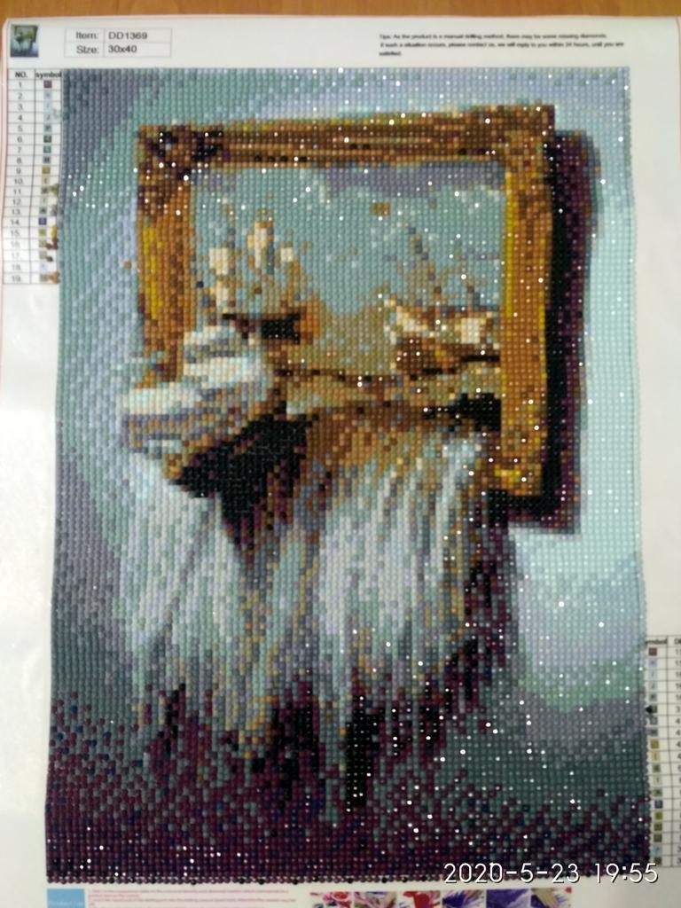 Интересная картина. Пока в процессе сборки. Пока все ок. Закончила картину. Собирала три дня. Полная выкладка. Удобно, что расфасовано в маленькие пакетики. Можно часто менять цвет и не думать как и куда ссыпать пока ненужные алмазики. Очень интересная картина. Пять с плюсом.