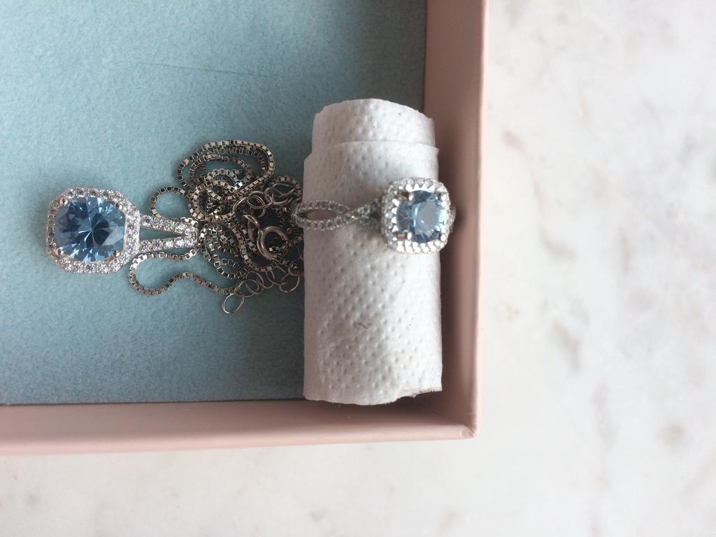 Тот же 👍бренд UMCHO, набор. С кулоном и колечко.небесно-голубой цвет, колечко заказывала 8 размер. Подошло, хорошо. Но больше всего из всей этой ювелирной истории нравится кулончик. Камень побольше, да дизайн интересный. На всех изделиях включая цепочку, стоит проба серебра.☺️🚚 ровно10 дней . 5 💥 Покупала за 1400 рублей, со скидкой часа и промокода.