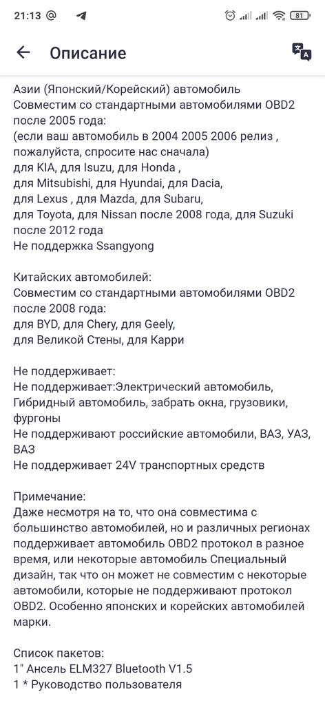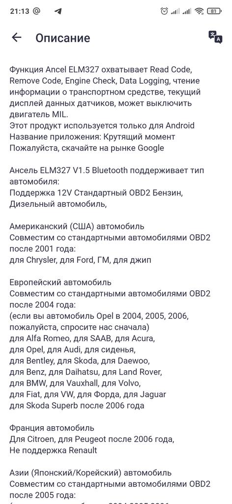 ANCEL Elm327 ELM 327 V1.5 OBD2 - диагностический автосканер Автосканер – это устройство, позволяющее самостоятельно провести диагностику двигателя автомобиля. Его использование позволяет существенно сократить затраты, связанные со стиранием ошибок в ЭБУ двигателя и поиском неисправностей, возникающих в различных системах управления двигателя и автоматической трансмиссии. Если Вам часто приходится обращаться с подобными проблемами к автодиагностам, то автосканер окупится уже после того, как Вы раза три пропустите свой к ним визит. Конечно, сам по себе этот прибор Вашу машину не починит, но при наличии определённых знаний устройства управления двигателем значительно облегчит Вашу жизнь. Автосканер elm327 имеет небольшие размеры, ведь, по сути, elm327 — это чип, адаптированный для подключения к разъёму OBD2 и, в зависимости от исполнения, позволяющий выводить информацию о состоянии двигателя на экран Вашего смартфона. Кроме того, с помощью автосканера elm 327 можно удалить ошибки из ЭБУ двигателя. Давно пользуюсь подобным сканером, неоднократно меня выручал. Вещь нужная. Установил на смартфон программу Torque, через неё провожу диагностику и отслеживаю параметры автомобиля. Но будьте внимательны, такие сканеры работают не совсем моделями автомобилей.