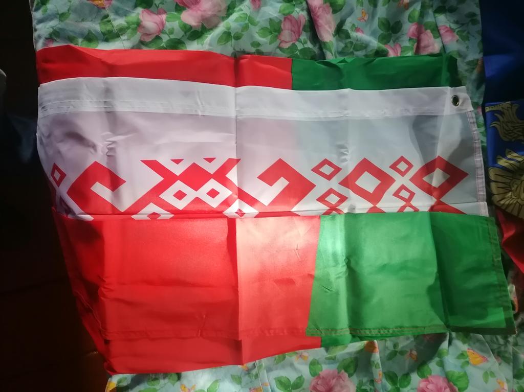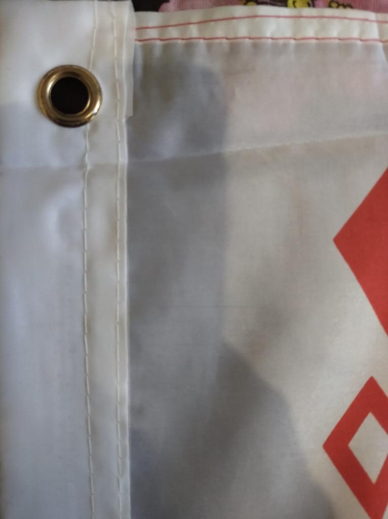По Беларуси продвигалась посылка очень долго. Вернее просто проторчал в Минске. От Минска до моей почты доставили за 2дня. Сам флаг больше заявленных размеров 91*155. Ткань просто прокрашена. Сверху и снизу вот такие заклёпки для веревки. Для древка надо будет что-то придумать. По качеству ткань смахивает на толстую подкладочную. Ну вообщем не плохо)))