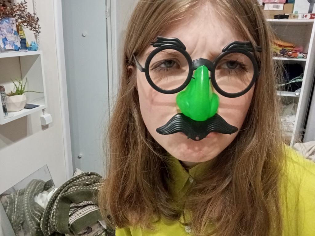 Думала, что будет красный нос, еле держится, усы при снятии очков постоянно слетают