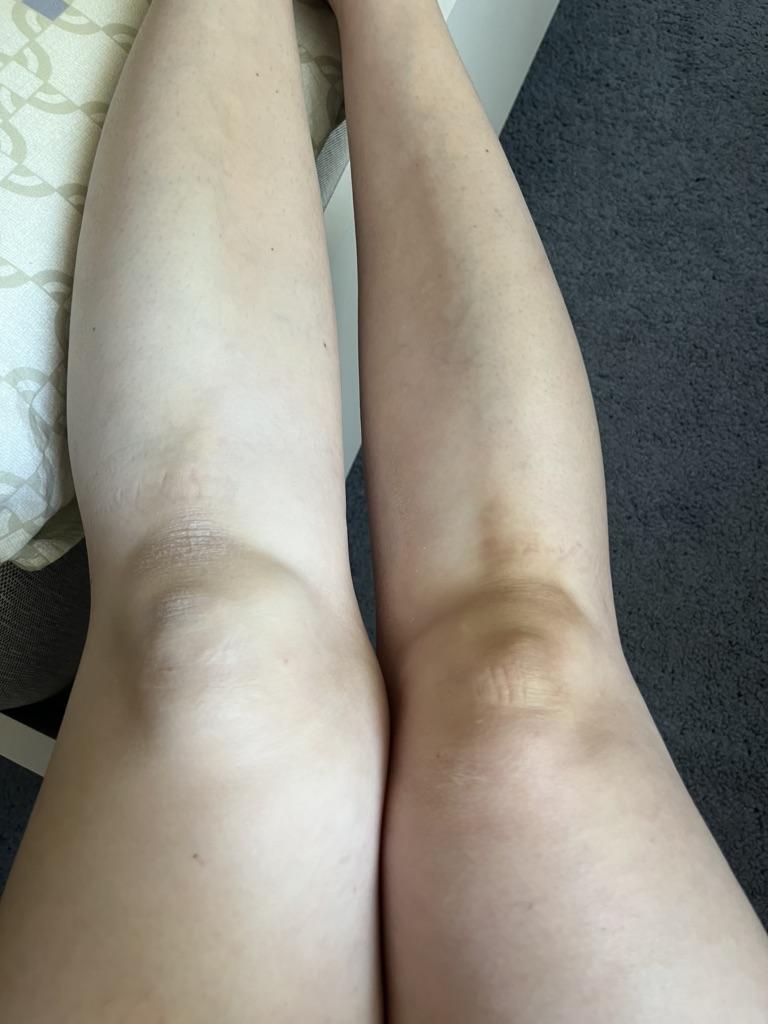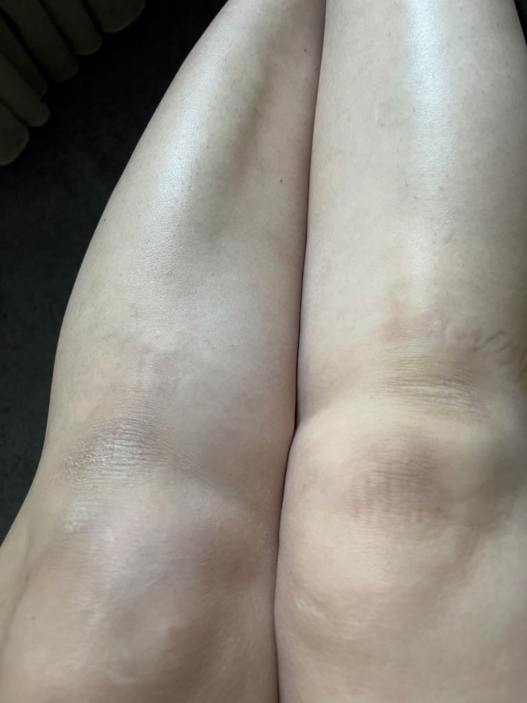 Не понятный конечно спрей🤷🏻♀️🤔 ни описания состава ни сроков годности нет вообще❗️ Ни не понятно что же там налито? Но рискнула по пробывать, брала конкретно для коленей и локтей, так как из-за не хватки витамином, цвет тёмный. Аллергии не вызвало. Очень много и сильно брызгает, всё вокруг белое😂 Перед тем как нанести куда то, обязательно смажет место увлажняющим кремом! На левой коленке без увлажнения, на правой с увлажняющим кремом. Подчеркивает шелушения.