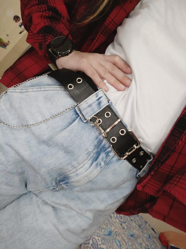 Ремень Блин какой офигенный ремень!!!! Я просто балдею! Вобщем можно выбрать черный или каричневый, ещё можно выбрать с удвоенными дырками, либо же с одной. У меня как видите черный с двумя дырами . Он очень крутой! Ну естественно не рассчитывайте что вам будет супер качественная кожа и материал. Но выглядит он супер. Чтобы просто для разнообразия разбавить образ, очень даже неплохо. С одной стороны, как изюминка, идёт цепочка. Она на карабинчике, и при желании ее можно снять. Я буду носить с цепочкой.