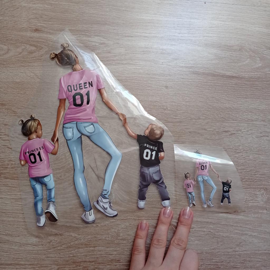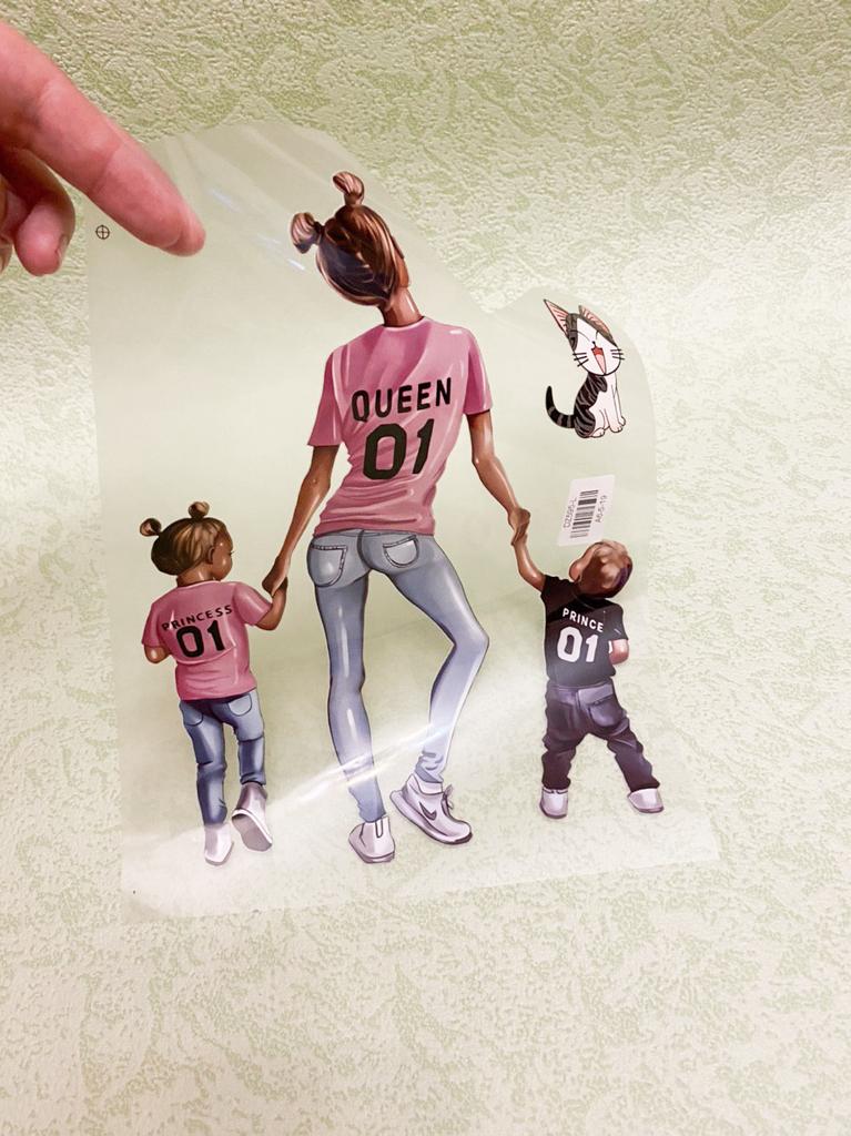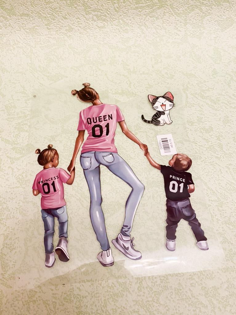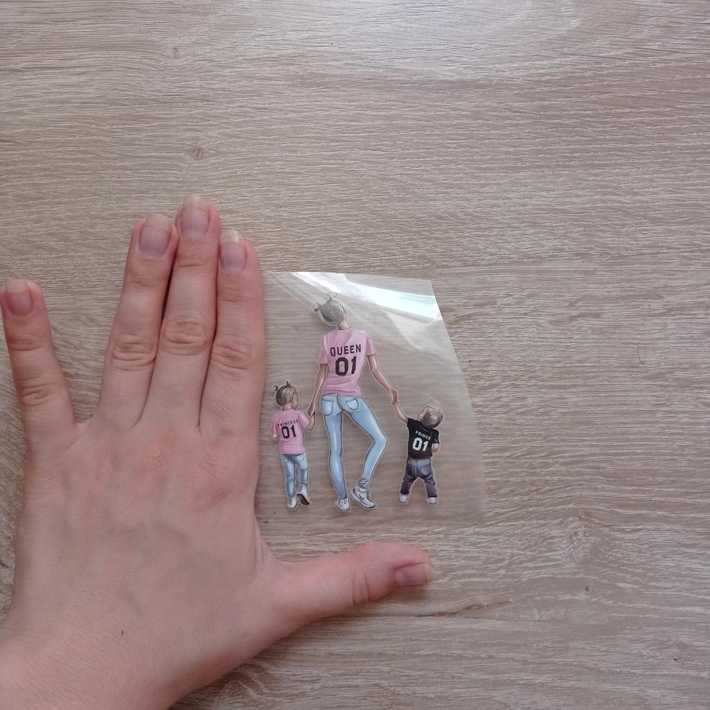 Я её очень ждала😍 В продаже не видела готовых футболок с таким рисунком: в основном мама и дочь, мама и сын, или с двумя дочками/двумя свночками Когда нашла наклейку, заказала не раздумывая. Клеится с помощью утюга У меня белая хб футболка. Приложила на нужное место. Накрыла плёнкой. Пригладила утюгом в течение 20 секунд. Проверила готовность и поддержала еще секунд 10 утюг. Отклеивать пленку лучше от тёплой наклейки. Приехала вместе с другими наклейками в одной упаковке. Не помята. 1в1 как на фото. В подарок продавец напечатал маленького котика, тоже наклейка Доставка 45 дней. Долго плутала по России. Буду заказывать ещё у этого продавца и Вам рекомендую 😉