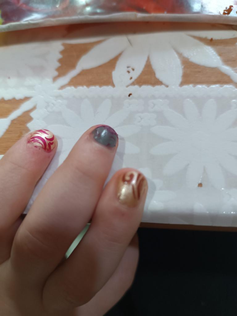 Заказ до Балашова долетел успешно. Не успела оглянуться, как месяц пролетел. Набор хороший, но к нему надо приспособиться. Главное научиться очищать пластинку, т.к. лак застывает быстро. Но это,как говорится, дело техники. Силикон прозрачный и через него видно ноготь, поэтому рисунком попадаешь в нужную точку, либо в нужный участок ногтя. При перевозке пластина немного прогнулась, теперь мне предстоит её как-то выпрямить. Не знаю, может в книгу между страниц вставить? Надо подумать. Набор рекомендую к покупке. Очень поднимает настроение. На фото смотрите, как он меня вдохновил. Спасибо.