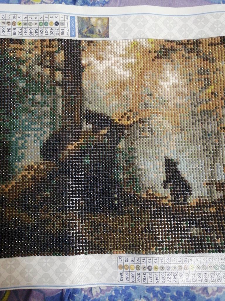 Очень темная картинка. Совсем не такая яркая как в описании. Надеюсь, что в готовом виде будет лучше. Стразы круглые. ДОБАВЛЯЮ. Реальный размер 25*35, а не 30*40. Не понимаю в чем сложность указать реальный размер рисунка, а не холста. При таком размере очень пиксельный рисунок получается. И нижняя часть картины, на мой взгляд, неправильно разобрали по цвету. Куча темных оттенков - и в итоге практически не определяется рисунок.