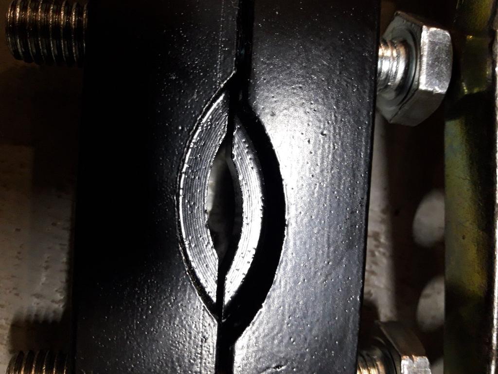 Несоосность отверстий резьбового соединения. Одна прижимная пластина не совпадает по центру с другой. Втулка приварена тоже криво. Кривой весь. Брак.