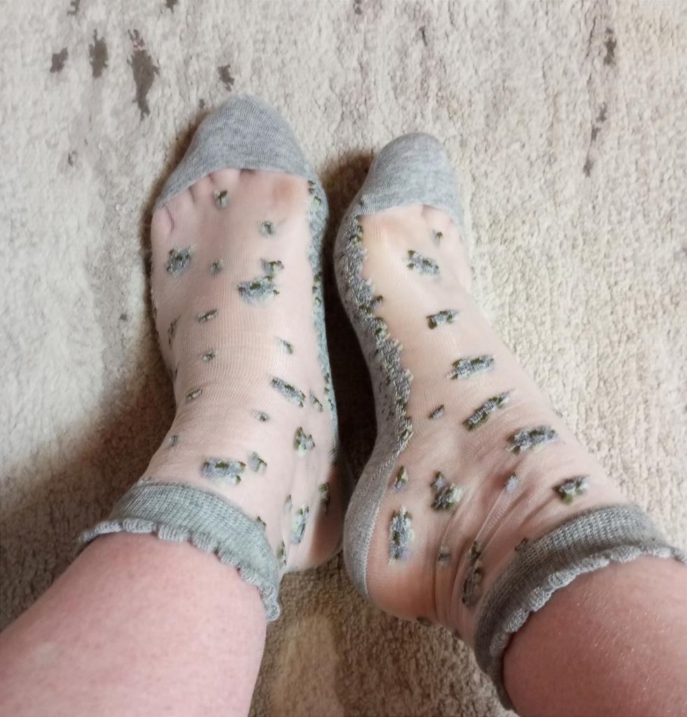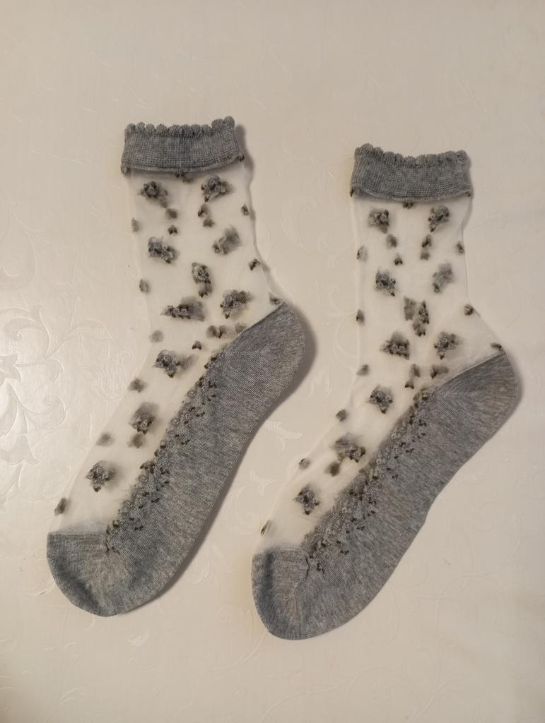 Интересные дышащие носки. Наполовину прозрачные из затканной обьемными цветами сетки. Наполовину хлопчатобумажные. Сетка сверху стопы, в верхней части носка, а след, мысок и резинка - из хлопка. Выглядит очень мило, цветочки придают носкам женственность. Носки хорошо впишутся в самые разнообразные образы. Я заказывала сразу две пары - серые и розовые. Эти носки серые. Носки упакованы в пакет, приехали за 38 дней. Продавцу спасибо, Джум спасибо. Рекомендую, очень классные носки!