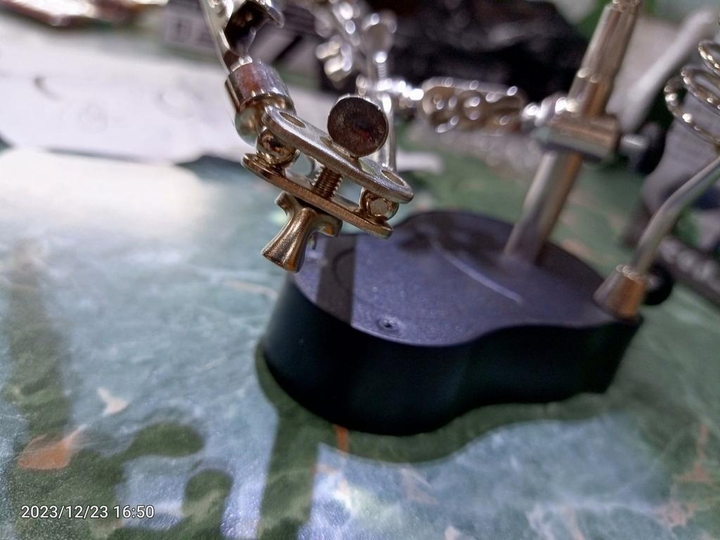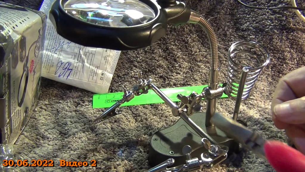 Зажимы хлипкие, затягивать приходится плоскогубцами, чтобы не съезжали (см. Видео2). Выдерживают вес линейки :)) Гибкий шланг у линзы коротковат, так что смотреть на зажатую плату можно только НАВИСАЯ сверху; сидя за столом, как обычно, под углом 45÷60 градусов не получится: линза так близко к плате (на фото - линейка), что до неё остаётся 3см, паяльник не засунешь. Но вишенка на торте - это ЛИНЗА! Изображение идёт такими волнами (см. Видео3), что лучше вообще без неё. Может, конечно, это только мне так не повезло; смотрю по другим отзывам - люди в основном довольны.
