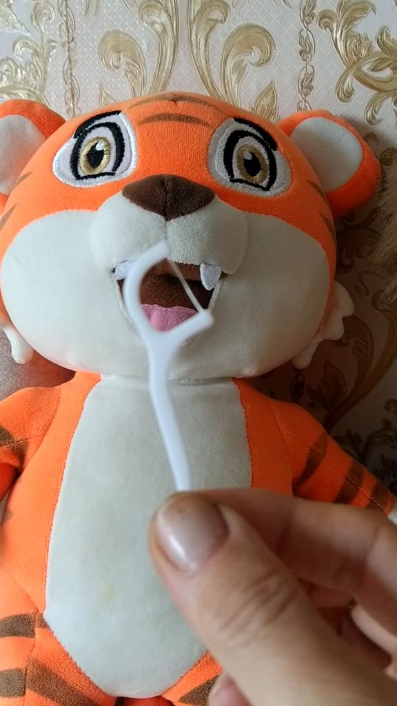 Ребенку 6 лет, чистит зубы с удовольствием и себе и тигру.