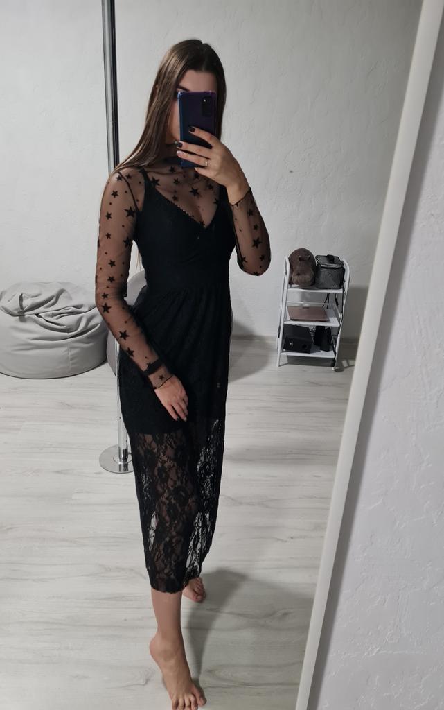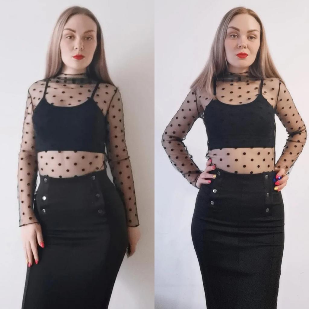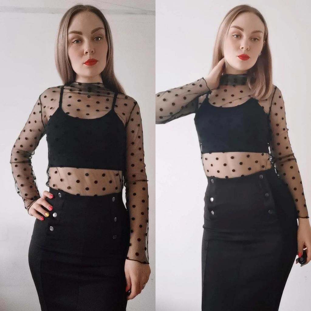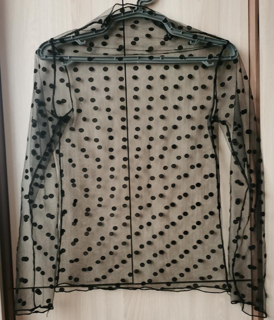 Прозрачная чёрная блуза в горох. У продавца представлена в едином размере. На мои параметры 83/ 72/93 подошла. Размеры: Длина: 63 см. Длина рукова: 60 см. Плечи: 36 см. Пошив в облости шеи, очень интересный. Ткань немного собирается в гармошку, хотя в этом я вижу некую изюминку этой блузки👌 Можно носить как с юбкой, так и с брюками, джинсами и всем что давно залежалось на полке 😉 Доставка до Забайкальского края 3 месяца. Трек не отслеживался.