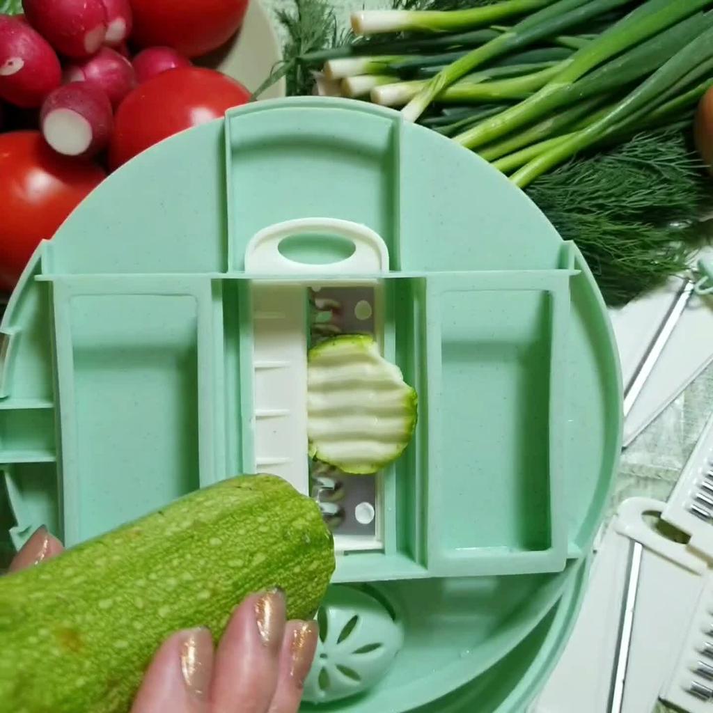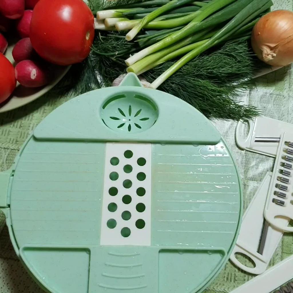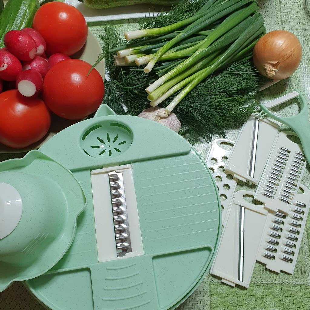 Мультирезка для овощей Эта овощерезка привлекла меня хорошей функционильностью. Ее можно использовать не только для нарезки овощей. Также она будет назаменима, если нужно нарезать сыр. Однако, отличную оценку я поставить не могу. Начну по порядку. Во первых, на промофото и по описанию набор должен был включать в себя: контейнер, дуршлак, крышку с теркой и разделителем яичных желтков и белков, овощечистку, пять насадок, вставляющихся в другую крышку, и плододержатель для безапасности. Мне пришел набор в другой комплектации, но с тем же набором функций. Правда, на фото выбора при заказе показан мой набор. Итак, комплектация: Отсутствует дуршлак и отдельная крышка с теркой. Зато контейнер имеет носик и отверстия для слива воды. В крышке закрепляются пять сменных насадок со стальными лезвиями (две для нарезки соломкой 3 и 5 мм, две для нарезки пластин 1 и 1,5 мм, одна для нарезки волнистых кусочков) и шестая насадка - небольшая пластиковая терка. В крышке есть отверстие для отделения желтков от белков. В комплекте имеется овощечистка с керамическим лезвием. А вот плододержатель, похоже, от другого набора. Если устанавливать его по стрелкам, то оказывается, что упоры на нем шире, чем нужно. Использовать его можно только поперек, но эти упоры цепляются за металлические ножи. Однако, без плододержателя работать нельзя. Я попробовала, и почти сразу обрезалась. Больше всего мне понравилось тереть и нарезать сыр. Огурцы, редис, морковь, кабачки, картофель, репчатый лук и другие овощи можно порезать соломкой, кружочками или рифлеными ломтиками. Не получилось у меня только нашинковать помидор. Ножи в насадках всё-таки не достаточно острые. (Поверьте, у меня есть с чем сравнивать). По описанию материал - пищевая нержавеющая сталь и пищевой пластик BPA free (не содержащий опасный бисфенол-А). Все возможные функции я постаралась показать на видео. Рекомендовать из-за неподходящего плододержателя и недостаточной остроты ножей не могу, но решать покупать или нет, только вам. Может быть, это только мне случайно не повезло. Для своей цены мультирезка не плохая. Цена на момент покупки 724₽. Доставка до Москвы за 15 дней с отслеживанием до почтового отделения.