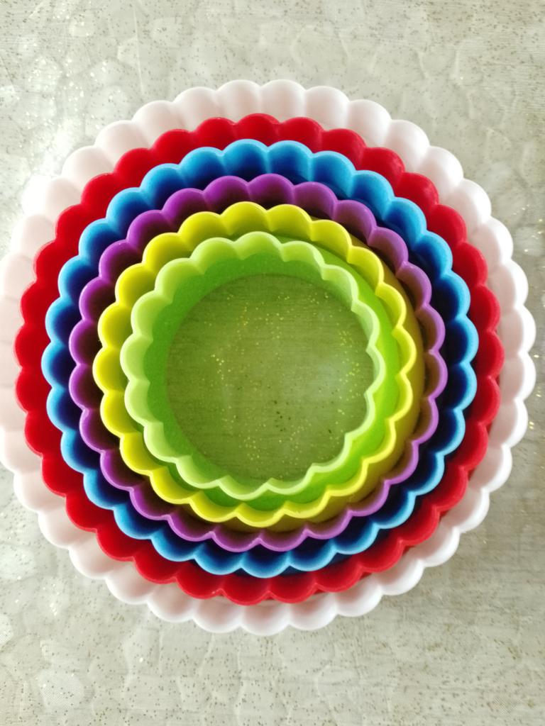 Набор разноцветных круглых формочек (6 штук) для вырезки изделий из теста (думаю,можно и не только для этой цели.) Материал: пластик Двухсторонниие: одна сторона волнистая, другая - ровная. По окружности по центру есть ребро жёсткости, что не даёт формочке сильно деформироваться при нажатии на неё. Пока всё класс! Осталось применить в работе. Продавцу и работникам производства спасибо. Также спасибо Джуму и службам доставки. Спасибо мужу за помощь и спасибо всем за личные обзоры. Всем успехов и добра 🌺