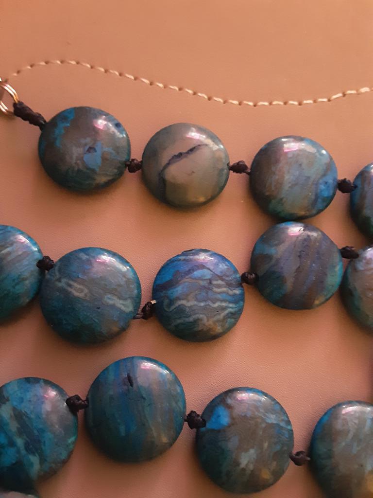 Пришли заветные бусы.агат или яшма синяя я так и не поняла.Но я их сразу опустила в ведро с водой и потерла-а руки то посинели!Толи грязь толи краска!Я так расстроилась.А на бусинах трещины и рытвины.Чуть не заплакала.Хотя думаю на настоящих камнях это может быть,но ведь они как бы выточены в форме круга.Холодненькие,тяжоленькие.Ну на 4 из 5.всего 25 кружочков на замочке гдето 1,5-2см.Но тут такого нету и вообще планирую купить такие же ,но с другим камнем.Спасибо.