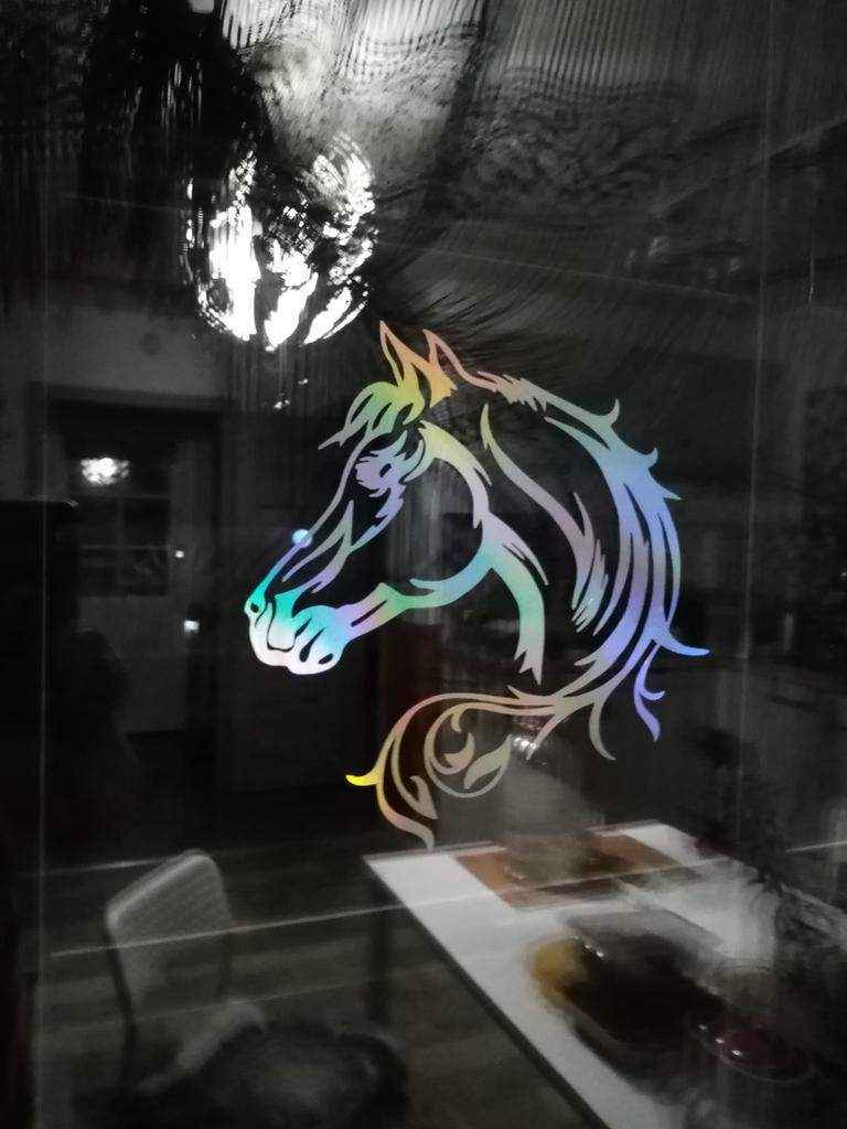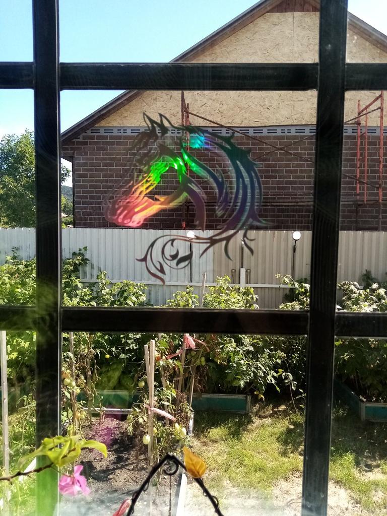 Ой, какая красивая наклейка.. Немного помялась. Надеюсь, что заломов не будет видно.. Шикарная лошадка.. Спасибо. Теперь можно смотреть на радужную лошадку, а не на строящийся дом. Га раме тройное стекло и в солнечный день лошадь и дома светится всеми цветами радуги.
