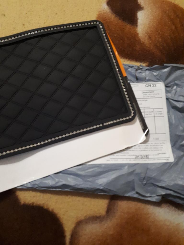 Коврик пришёл в упаковке открыла а там камушка не хватает не критично но всё же....а так коврик хороший телефон с него не слетает коврик тоже не катается. Спасибо продавцу и джум