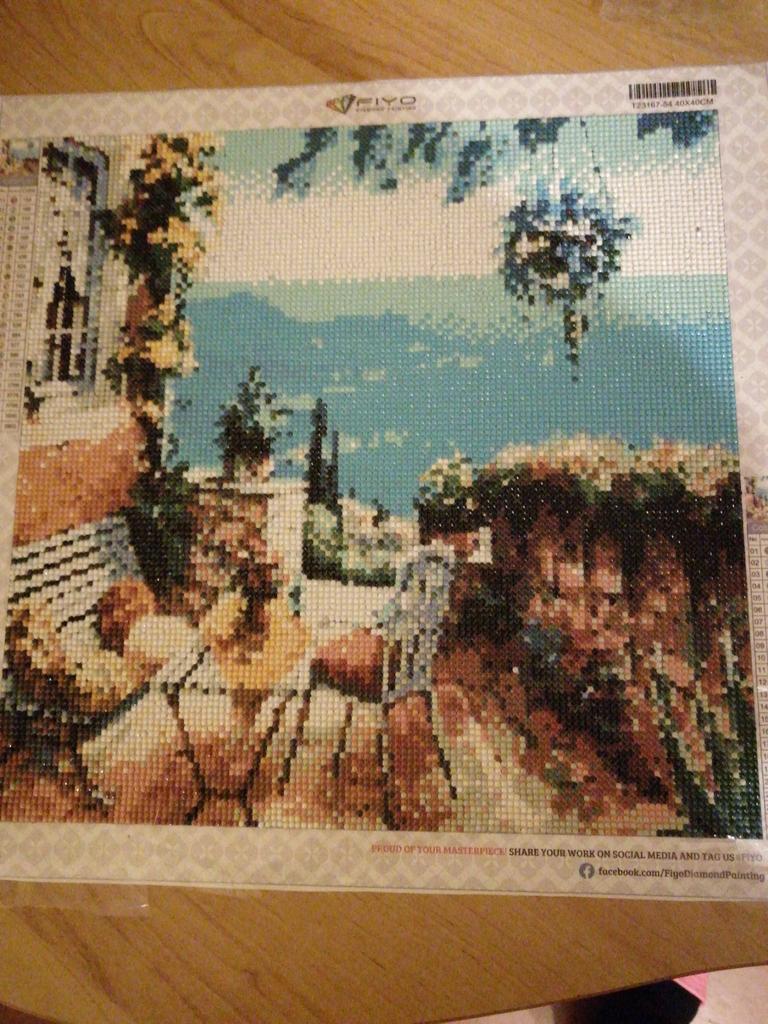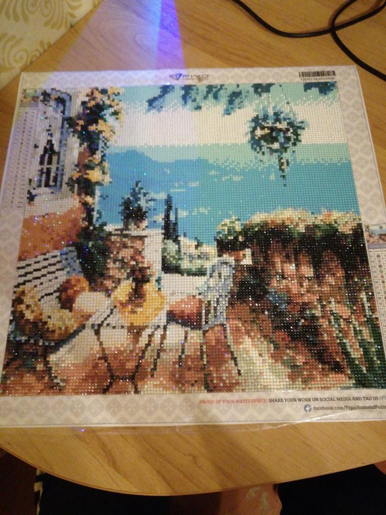 Заказ шел чуть больше месяца. Сама картина намотана на валике, не помялась. Выкладка полная. Но мне не пришло 2 цвета...пусть их немного надо выложить, но все таки... только за это 4 звезды. А так увлекательно. Спасибо джум.