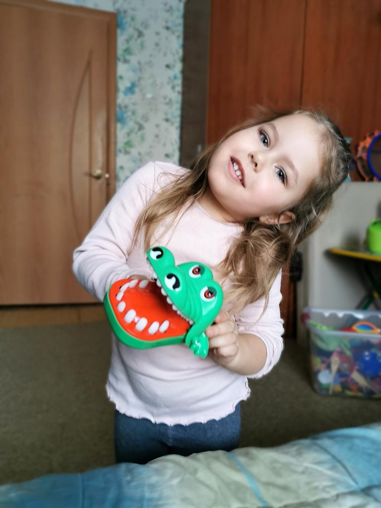 Детская игрушка крокодильчик 🐊 Промокод на скидку - 5% 🥰 CCTS47HNNH 🥰 Только посмотрите, как дочка радуется.... Как только посылку доставили, Ева говорит, это мне подарок? Давай откроем? 😂 Я до последнего оттягивала время, пока мы не зайдём в квартиру. И первым делом мы пошли не обедать, а посмотреть, что же там за подарок 😄 Крокодильчик компактный небольшого размера. Состояние полностью рабочее. В процессе транспортировки: поломки, трещин и даже потертостей не образовалось. Евочке, крокодильчик очень понравился. Играет с удовольствием. Игра на везение, кому укусит палец, а кому нет. На каком зубике защёлкнется, остаётся только гадать. Верхние зубы у игрушки резиновые, поэтому, когда челюсть кусает, пальчиками малыша совершенно не больно. Нижние зубы пластиковые, нажимаются легко. Глаза и нос у крокодильчика на бумажных наклейках. Игрушкой остались довольны на 💯. 🚚 Доставка до Саратова на удивление ооочень быстрая, всего за один месяц.