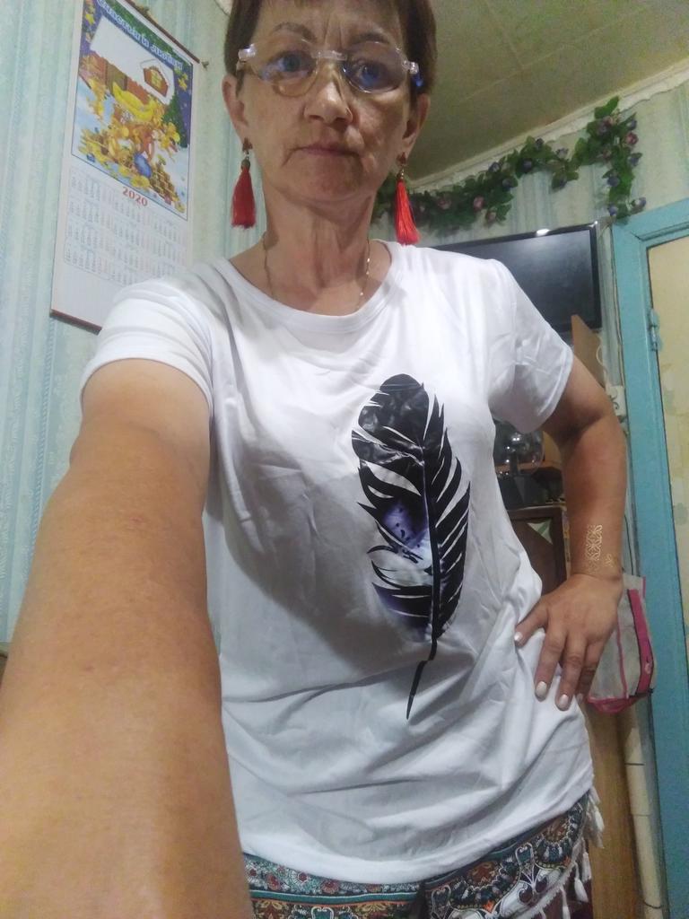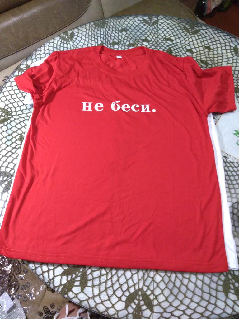 Получила футболку белую с рисунком ,,перо,,. Размерчик Lка как то в этот раз большеват .Хотя на самой футболке нет размера, а только на пакете приклеен. Так что неизвестно, какого размера футболка. Наложила другую,красную, сверху. Видно вам или нет, по бокам белая см на 2 шире.Рисунок наклейка, что меня немного разочаровало. А так хорошая, сшито аккуратно , не пахнет.