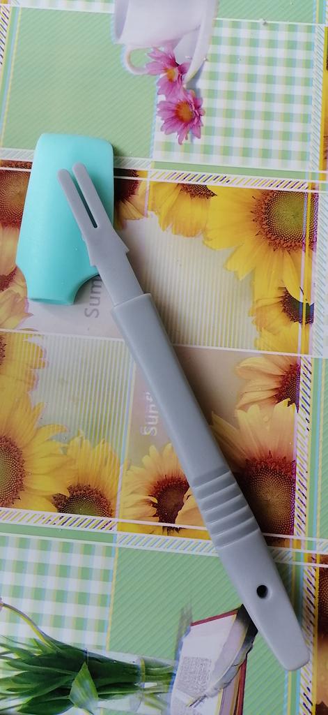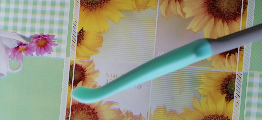 Малюсенькая лопатка из силикона. Что мне понравилось в этой лопатке, это ее загнутый край, удобно собирать по дну емкости, в основном маленького объема, т.к. повторяюсь, сама лопатка маленькая, но мне такая и нужна . Сама лопатка плотная , а край ( загнутый) мягкий.