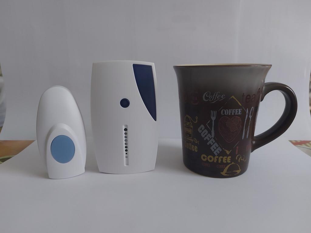 Очень милый звонок не большой (на фото для сравнения рядом чашка), но звонкий, мелодий много разных, батареек для колонки не было, купили 2 маленькие, в кнопке батарейка была. Липучка для крепления кнопки в комплекте, колонка крепиться на маленький бортик (фото с обратной стороны прилагается)