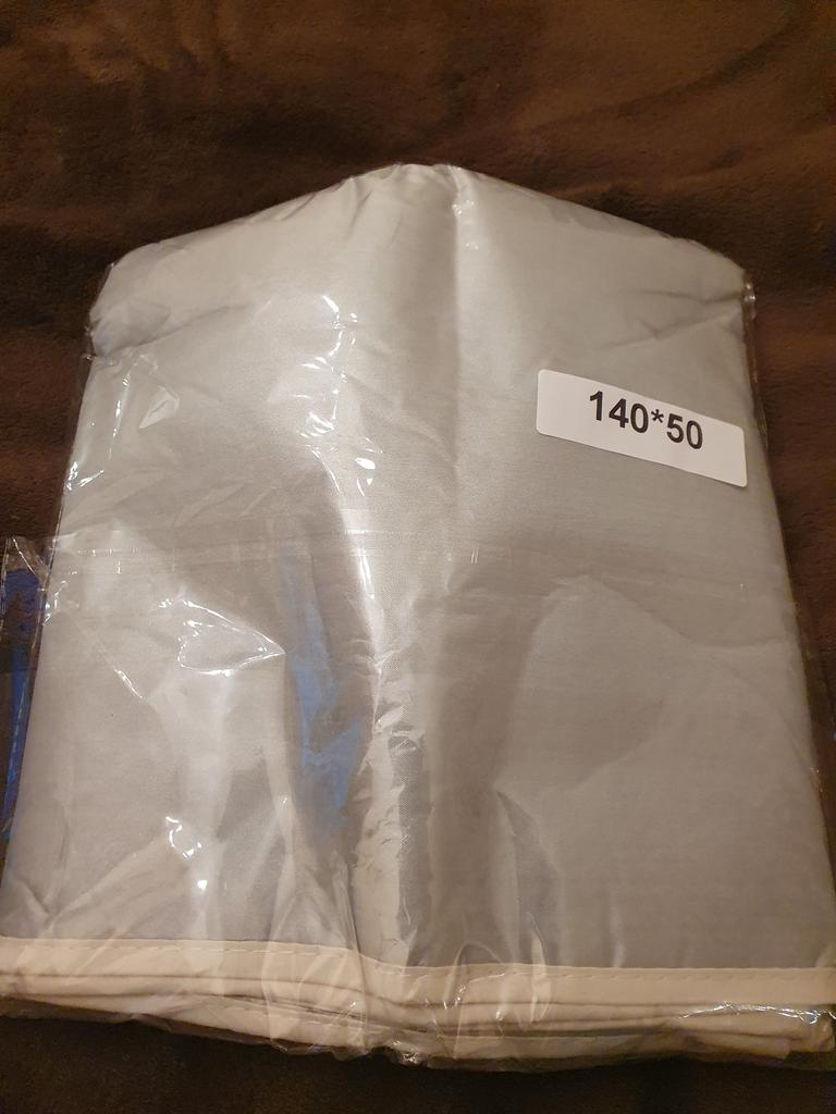 Чехол для гладильной доски За всю свою некороткую жизнь хозяйки ни разу не встречала чехол, который никому не удалось бы прожечь. Вечного ничего нет. Поэтому всегда покупаю чехол про запас. Термоусадочный взяла впервые. Тонкий будто накрахмаленный синтетический тканый материал матового серебристого цвета. С изнанки проклеен тонким 5-миллиметровым поролоном. Край обтачан косой бейкой. В ней продернут шнурок для затягивания. Размер действительно 140х50. Гладить на доске, затянутой этим чехлом удобно. Правда это не решает главной проблемы. Ненавижу гладить.