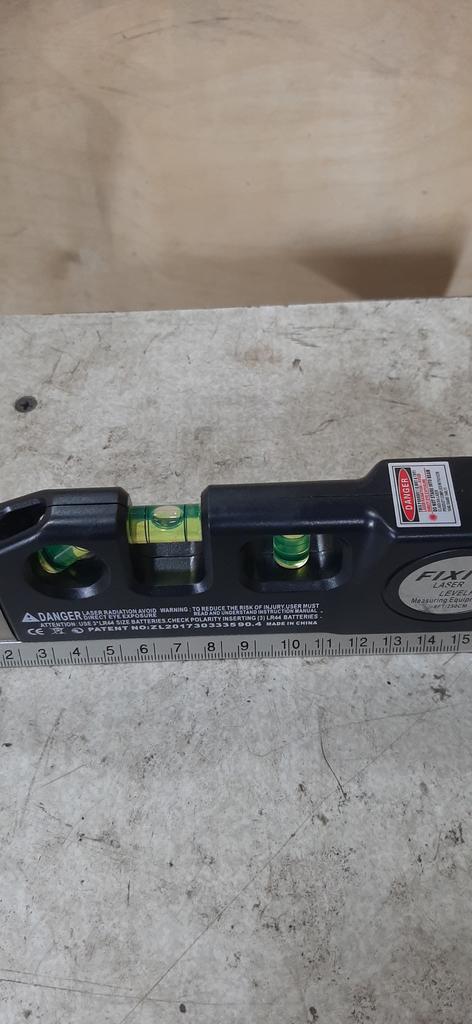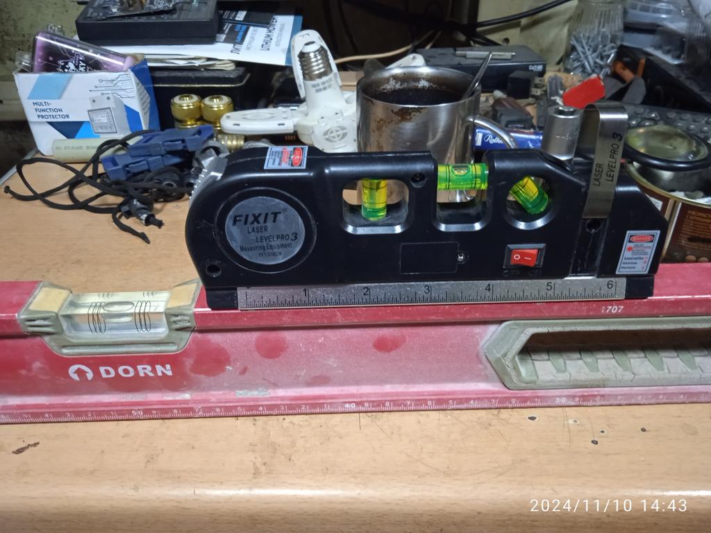 Отличный недорогой инструмент с универсальной комплектацией инструментов в одном: с выдвижной линейкой на 2,5 метра, шкалами линеек по боковым сторонам прибора в сантиметрах с одной стороны и в дюймах с другой стороны, три уровня для разных углов измерения и лазерные лучи при включении прибора (поставляется без батареек, батарейки 3 шт. LR-44 легко купить и вставить в отсек для них), маленькая тренога с установкой регулировки в разных положениях при дополнительном заказе. Хорошая помощь этим инструментом при домашнем ремонте.
