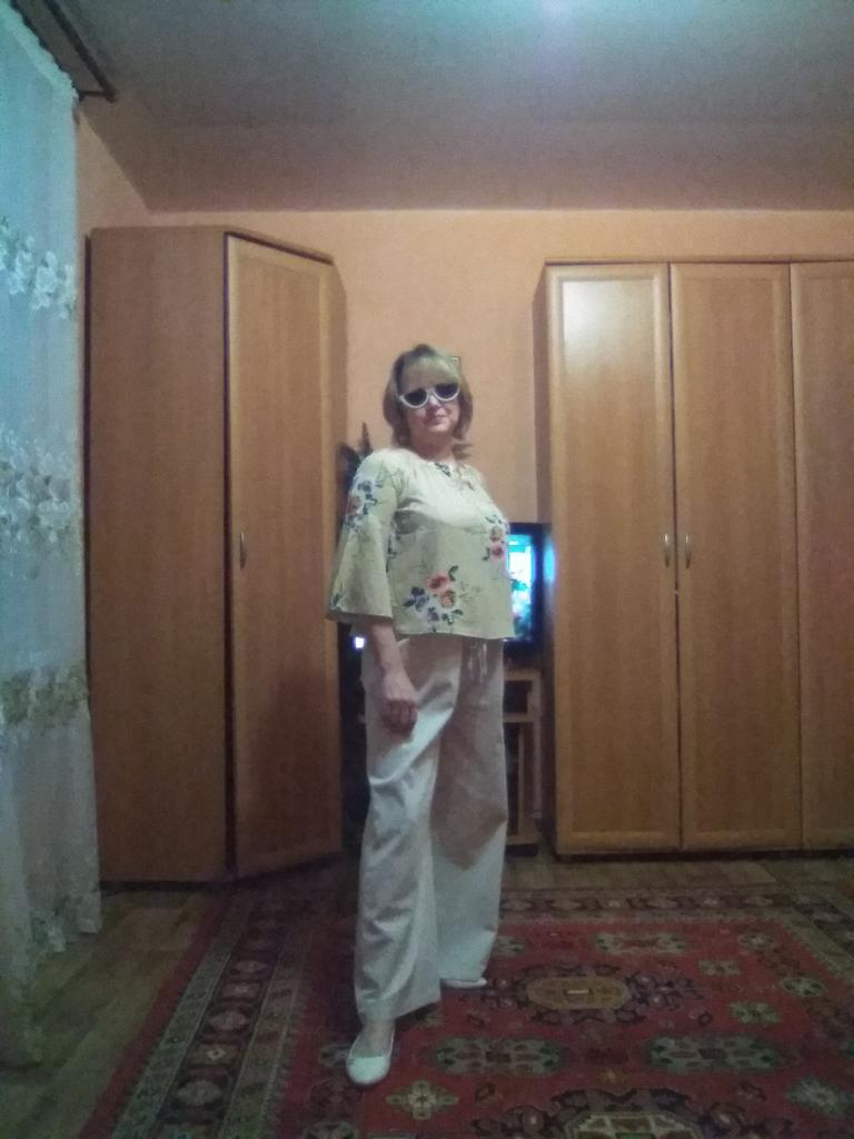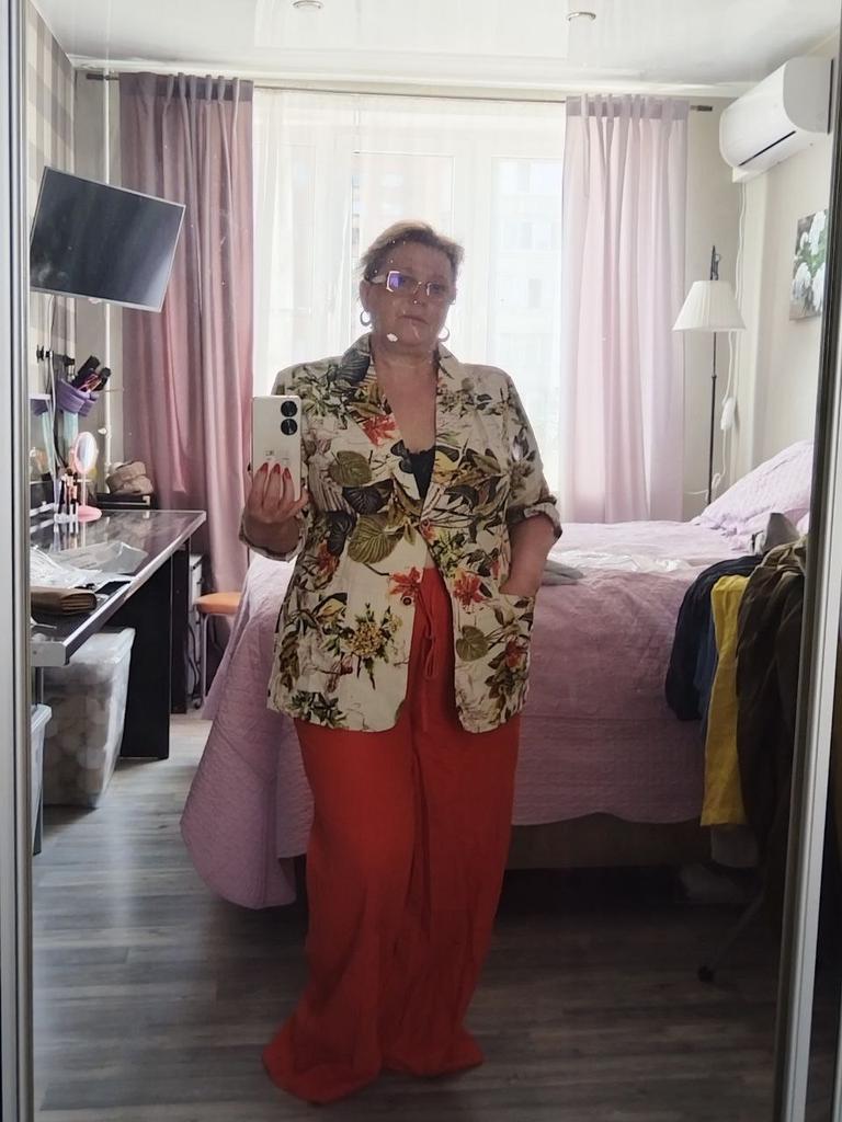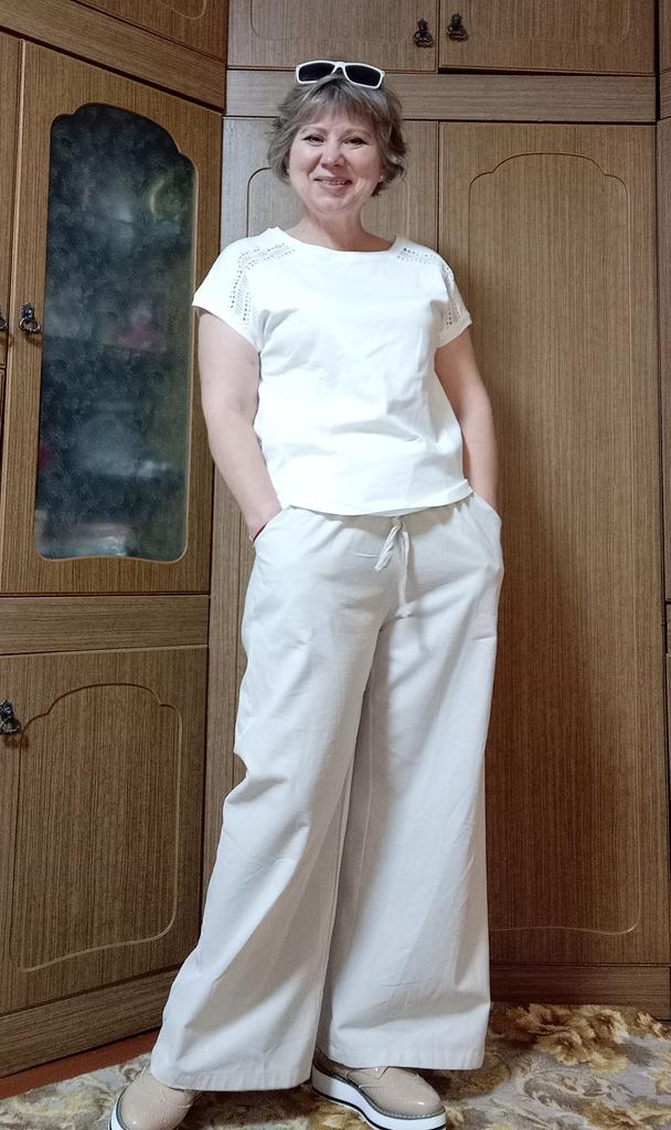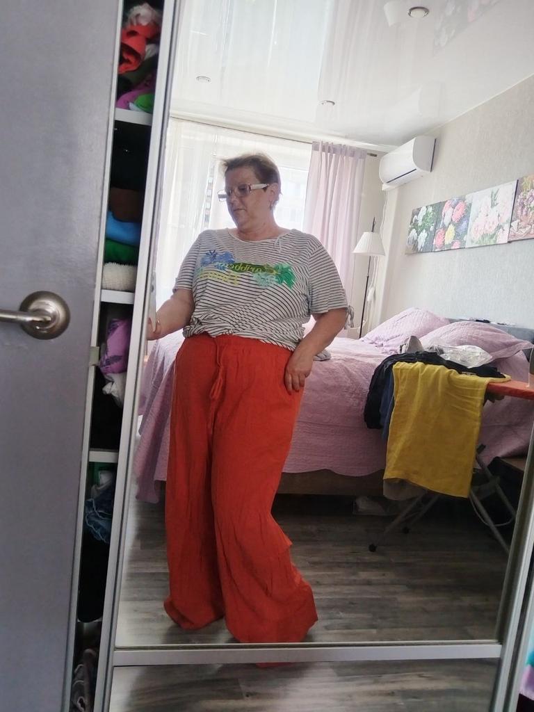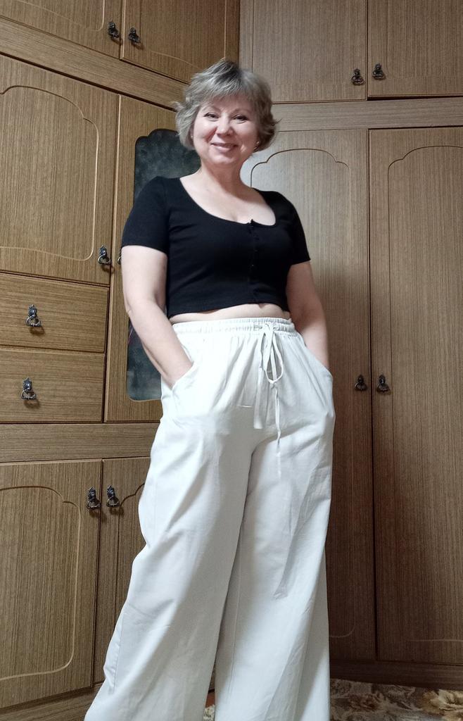 Свободные летние брюки их хлопка(действительно хлопок). Лёгкие, немного просвечивают, но т.к. они широкие,нижнее бельё не видно. Взяла самый маленький размер L на свои параметры рост 156,ОТ 90,ОБ 95(да, этакое брёвнышко 🤭). Мне кажется, что они мне великоваты в бедрах, ну уж слишком свободные, может быть ушью немного, а может и так оставлю... По талии вшита резинка, в растянутом состоянии 100см, посадка высокая. На мой рост полноценная длина, можно и под каблук, и без него. Качество отличное. Швы все ровные, торчащих ниток не нашла. Рекомендую. На лето замечательный вариант.