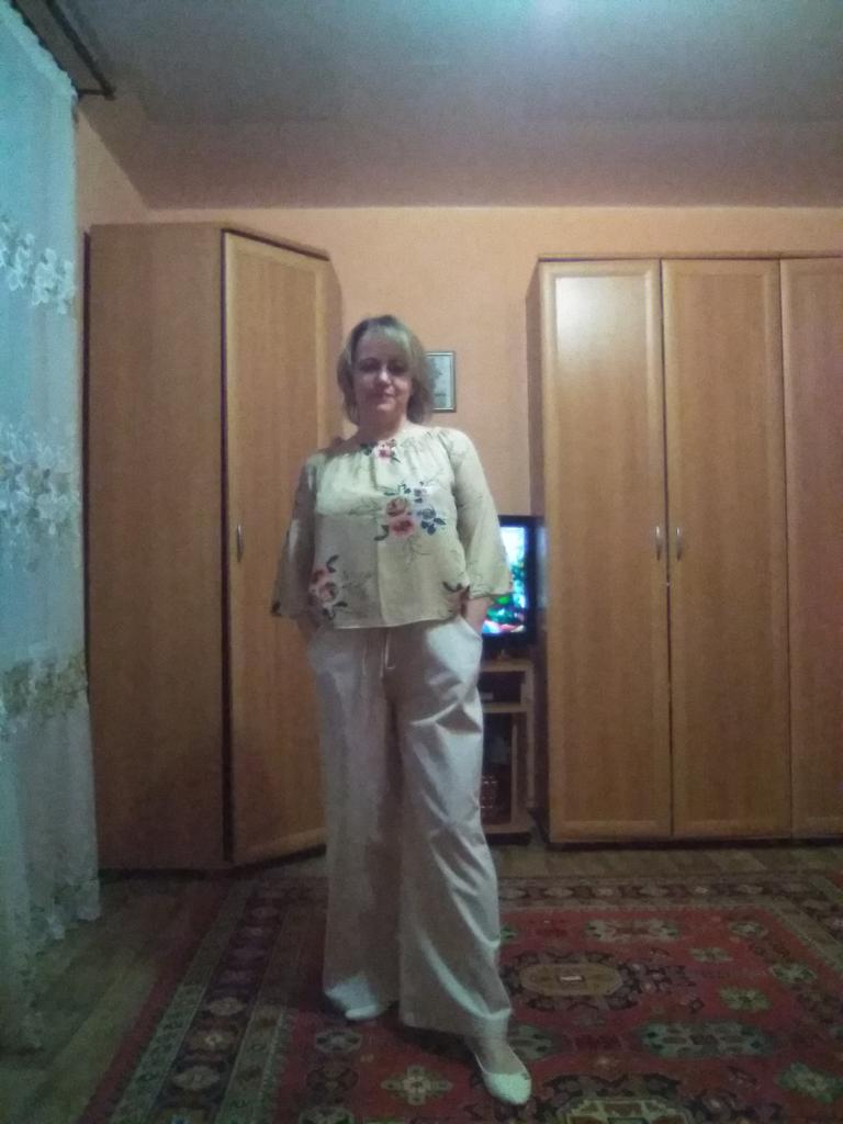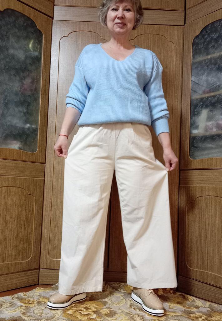 ШИРОКИЕ БРЮКИ В ФАРФОРОВОМ ЦВЕТЕ Это вторые по счету брюки ( первые зелёные) и на размер больше взяла, то есть XL.... Мои параметры 85/104 рост 162 Порадовала длина брюк.... Цвет не бежевый..... скорее всего фарфоровый цвет....это редкий цвет и универсальный....и меня это устроило и порадовало... Материал: смесовая, больше хлопка.... комфортно, мягко, просвечивает , мнется в меру, по плотности тоньше, чем у зелёных брюк... летний вариант.... Реальные измерения без натяжения: Длина изделия 102 см ОТ 78 см ОБ 123 см Любителям свободы и простоты однозначно рекомендую