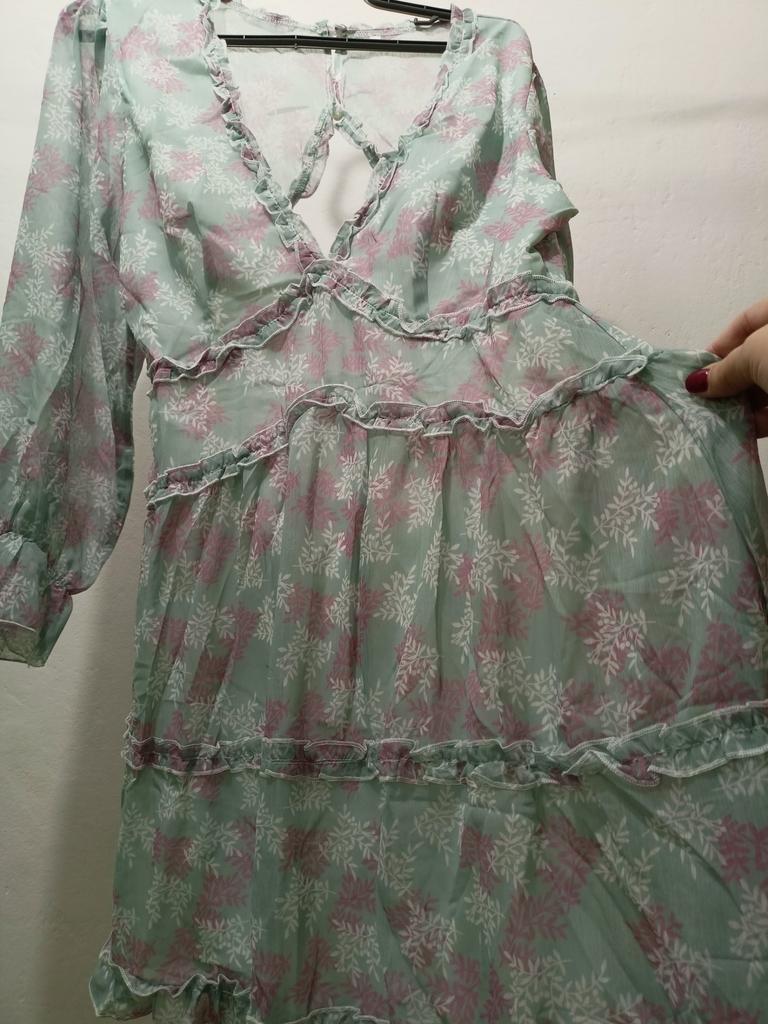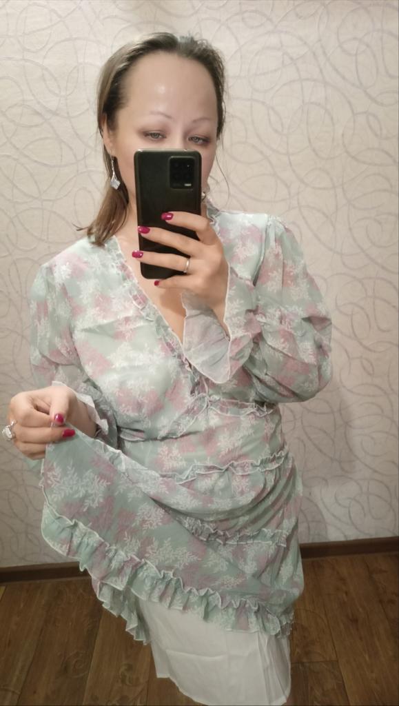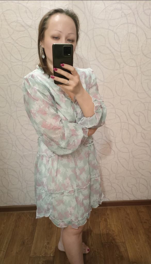 Красивое, нежное летнее платье , скажу сразу что оно мне велико так как я специально заказала размер xl чтобы длина платья была нормальная, а ширину я подгоню под себя, прошу прощения что не поглажено, меряю сразу из посылки просто чтобы показать какое платье и потом убрать так как лето практически закончилось и подгонять прямо сейчас я его не буду. Материал платья тонкий, воздушный, подклад белый и более плотный полиэстр, на спинке подклада нет. Фасон красивый, женственный, спинка открыта, вырез на груди глубокий. Мне платье нравится, спасибо магазину.