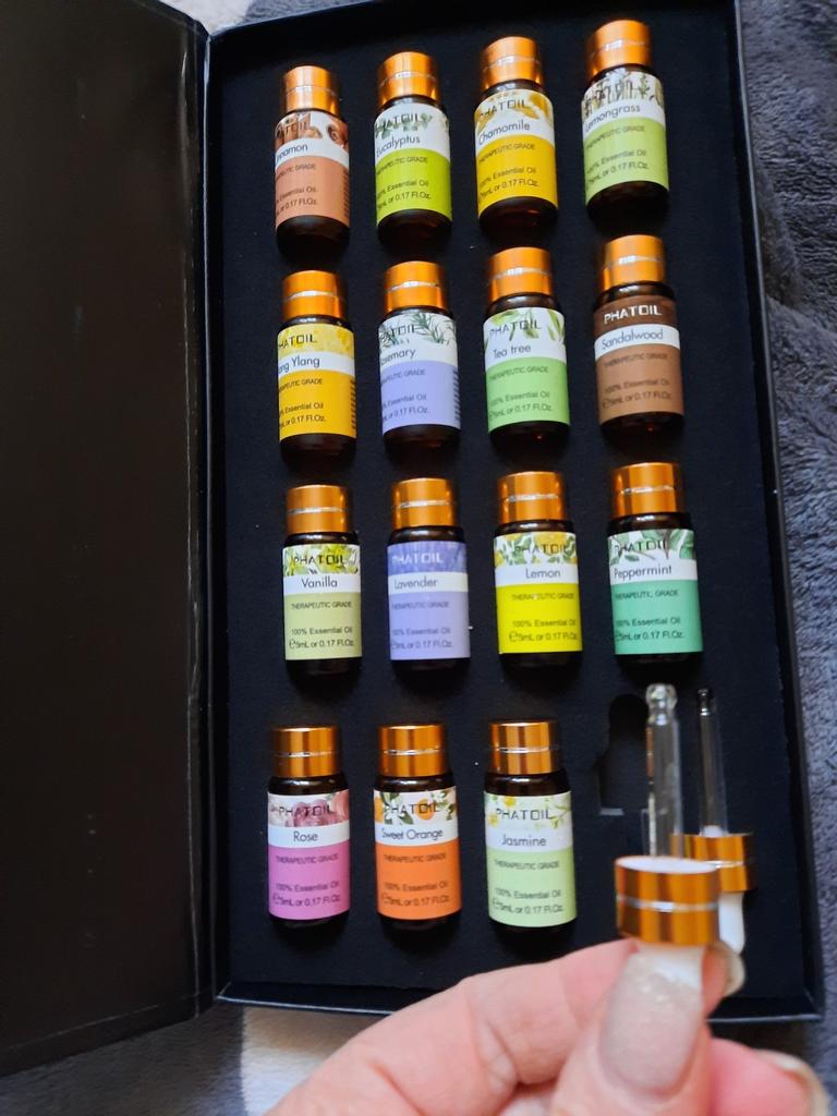 Подарочный набор эфирных масел от бренда Phatoil 💛 Давно заглядывалась на товары этого бренда. И все же решила оценить его набор эфирных масел, которые просто покорили меня своим оформлением 🧡. В нем представлены: Лаванда Жасмин Эвкалипт Ваниль Перечная мята Сандаловое дерево Апельсин Иланг-иланг Лимон Роза Чайное дерево Лимонник Корица Ромашка аптечная Розмарин Плюс в наборе идут две пипетки. Открываются баночки с маслом легко. В них нужно погрузить пипетку, чтобы получить порцию эфирного масла ✅ Для процедуры обычно хватает 2-5 капель. Так что расход здесь очень экономный. Я использую такие средства для аромалампы. Плюс рекомендую добавлять в горячую ванну. Аромат моментально распространяется по всей комнате. Запахи действительно сильные, натуральные 👍 Одни из лучших масел, что я покупала 🧡