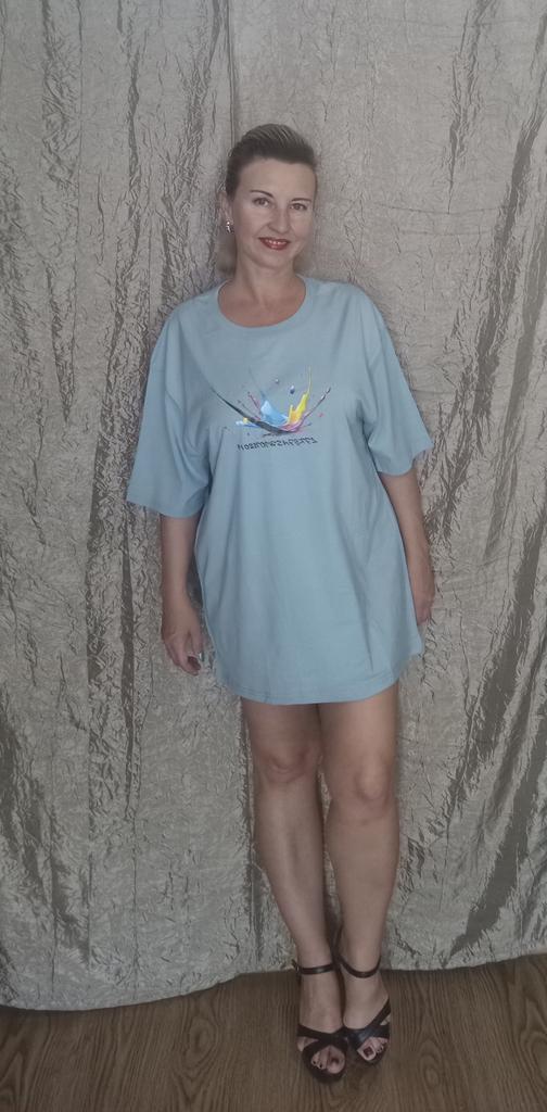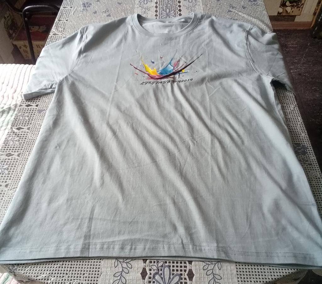Мужская хлопковая футболка 👍💯с интересным принтом 👍 Материал плотный, мягкий, приятный к телу 🤗, немного тянется ☝️ Цвет выглядит как на фото продавца 🙂: бледно голубой ☝️,принт -наклейка ☝️ Футболка для мужа,на параметры:ОГ 118см,ОТ 100,ОБ 125 см, рост 1,75 см, размер 6XL☝️ Брала уже такую футболку, только другого размера ☝️,всё удовлетворило в ней: качество отличное 💯👍, после стирки не линяет, не садится . По моему замеру на размер 6XL : ОГ 120 см☝️ По бёдрам также,так как футболка прямая 😉 Длина 75 см👍 Рекомендую 🤗 к покупке 👌💯