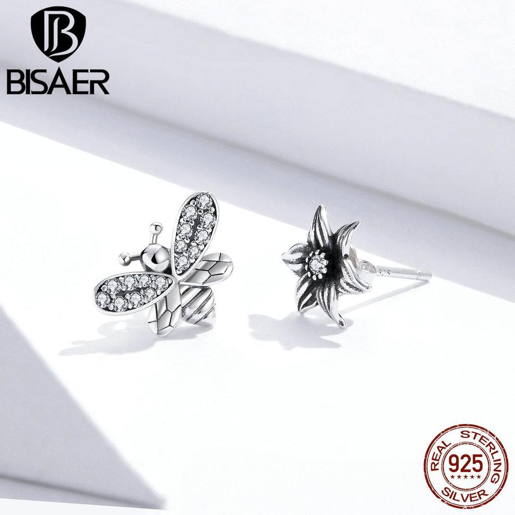 Bisaer Женские серьги-гвоздики из стерлингового серебра 925 пробы в стиле ретро с цветком и CZ Bee, ювелирные изделия в подарок