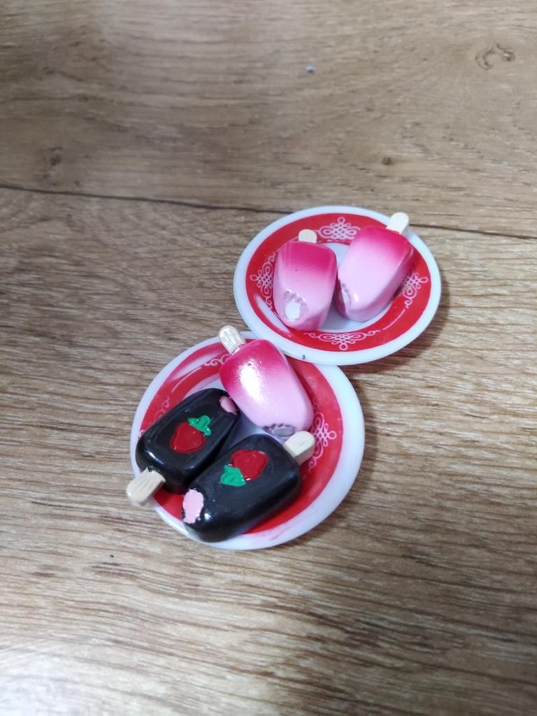 Комплект который пришел состоял из 3 шт жёлтых, 1 розовое, и 1 коричнево-белое мороженое. Самые простые без рисунка.