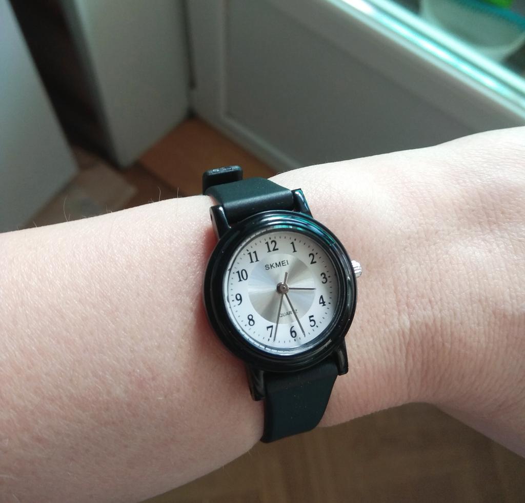 Быстрая доставка порадовала. Размер часов и длина ремешка разочаровали :( На мою окружность руки чуть выше косточки у кисти 18 см и мне комфортны 23 см длины ремешка, а тут 21 см. Циферблат маловат 2см. Звезду сняла за то, что я их бы рекомендавала как подростковые, а не взрослые. На фото видна разница между часами с цифер-ом среднего размера и этими.
