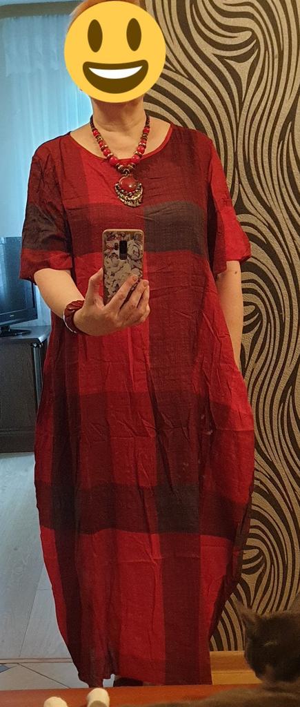 Платье интересного фасона, выглядит как на фото, удобное, очень легкое, хорошо сидит. На ОГ 100 - ОТ 73 - ОБ 98 размер 2XL сел свободно, можно было и на размер меньше взять, но хотела посвободнее, и опасалась, что сядет после стирки. При росте 168 длина чуть ниже середины голени, почти до щиколотки. Ткань хб, приятная к телу, довольно тонкая, просвечивает, но за счет рисунка и качества ткани это не так уж и заметно, мне это не мешает. Цвет красивый, как на фото - глубокий,в меру яркий. Сшито аккуратно. При первой стирке не село и не полиняло, но ткань после стирки выглядит как жатка, более текстурированной, можно и не гладить, оставить так, выглядит интересно, но чуть-чуть меньше в размере становится. Если погладить - размер возвращается к исходному. Доставка в срок, пришло все вместе с другими заказами в одном пакете. Покупкой довольна, спасибо)