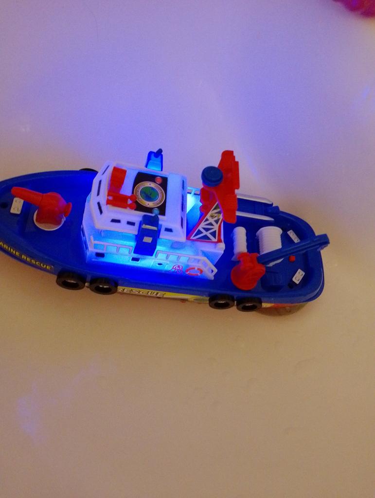 Хороший кораблик, светится, плевать, звук создана, всë как в описание, единственный минус упаковка мятая сильно и колëсик с боку сломан, пришлось заклеить, купили в подарок, но теперь не подарим из за упаковке не смотриться оставили.Батарейки не входят в комплект имейте в виду. Продавца рекомендую.