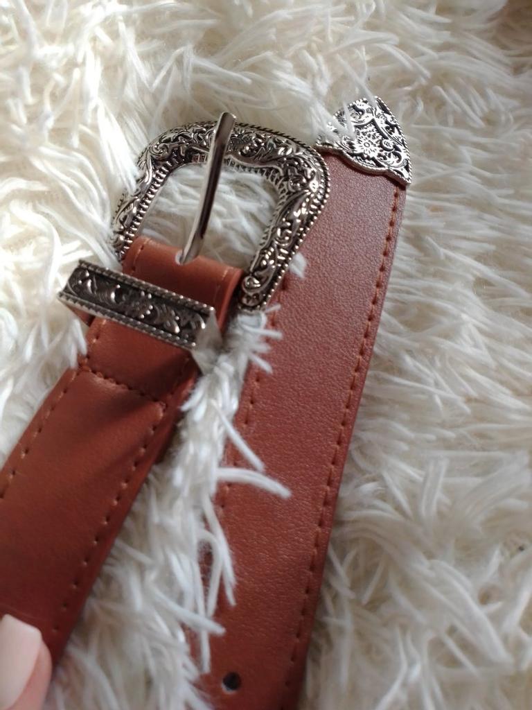 Ремень из дермантина средней жёсткости со специфическим запахом. Остаётся надеяться, что этот аромат покинет изделие. Судя по качеству материала, скорее всего долго он не прослужит - потрескается. Из плюсов: прошит аккуратно, декоративные части и пряжка красивые. Пряжка не сломана, что радует. Но запах с ног сшибает. Наверно пока на балкон определю, чтобы выветрился. Дополняю после использования. Запах выветрился без следа, но это единственный плюс. Надевала ремень всего несколько раз, но качество... По краям ремня дермантин излохматился, что с первого взгляда выдает очень дешёвую вещь. Не рекомендую товар. Если только взять ради пряжки и декоративной части на конце ремня, чтобы переставить их на более качественный ремень.