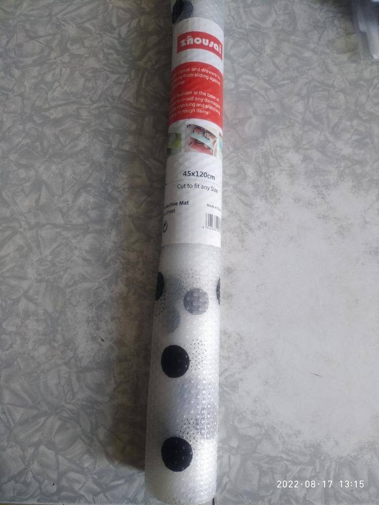 Коврик для шкафа пришел в общей посылке. Упакован в полиэтиленовый посылочный пакет. Не помят. Размер производителя на этикетке 45х120 см. Очень тоненький, тоньше 0,5 мм. Еще не пользовалась. Брала по скидке за 387 р. Хотелось бы дешевле.