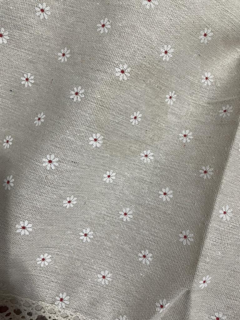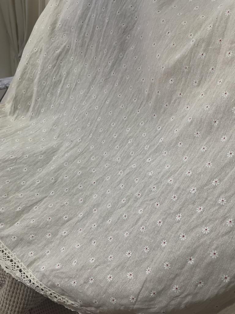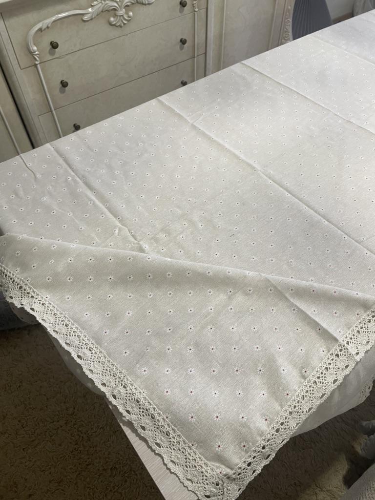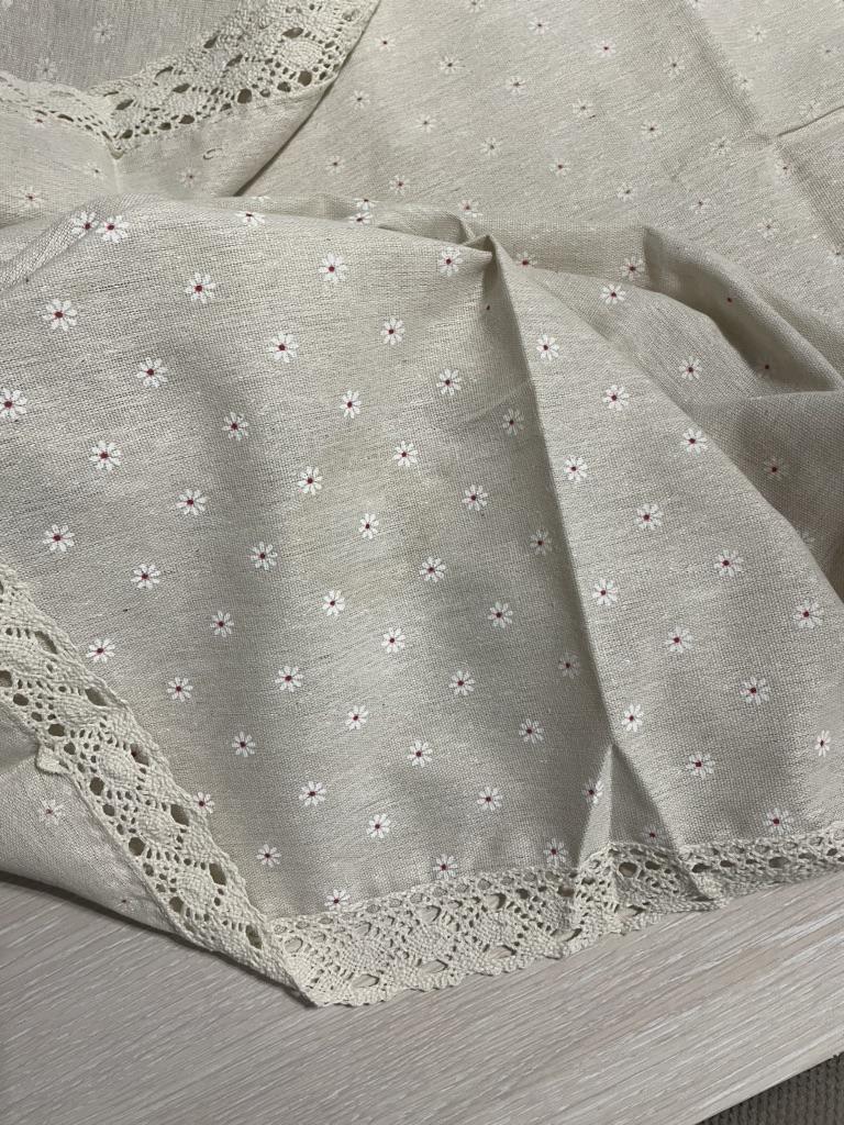 Скатерть симпатичная, по размеру соответствует, ткань хлопок, плотная, продажа на рогожку, кружево красивое, с темными цветочками смотрится красиво, спасибо продавцу и джуму, к покупке от командую!